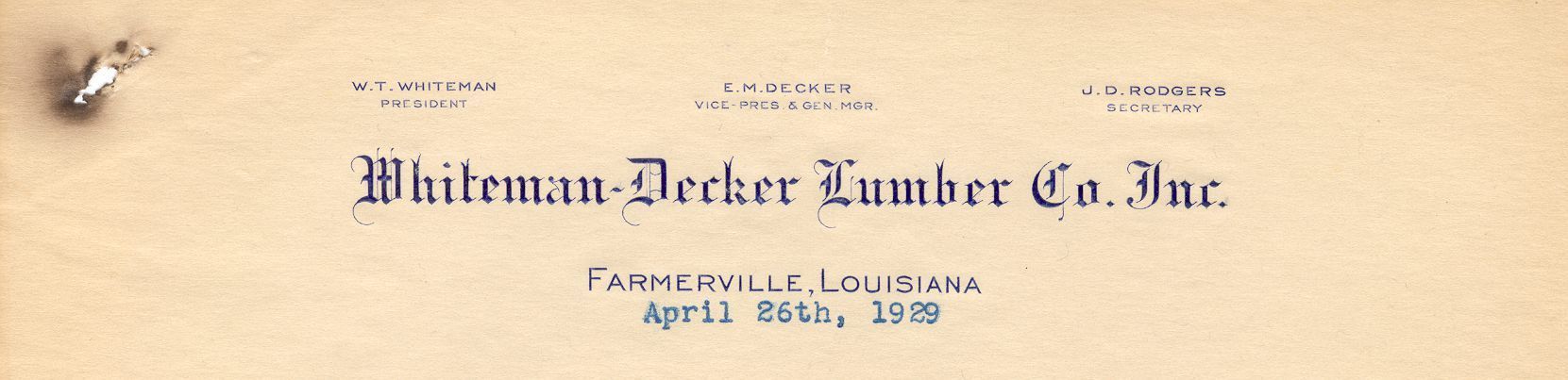 Whiteman-Decker Lumber Co., Inc. began operations in Farmerville, Louisiana. The company specialized in the booming lumber production occurring in Louisiana during the 1920s. However, the company was forced to close down due to local resources drying up.Collection