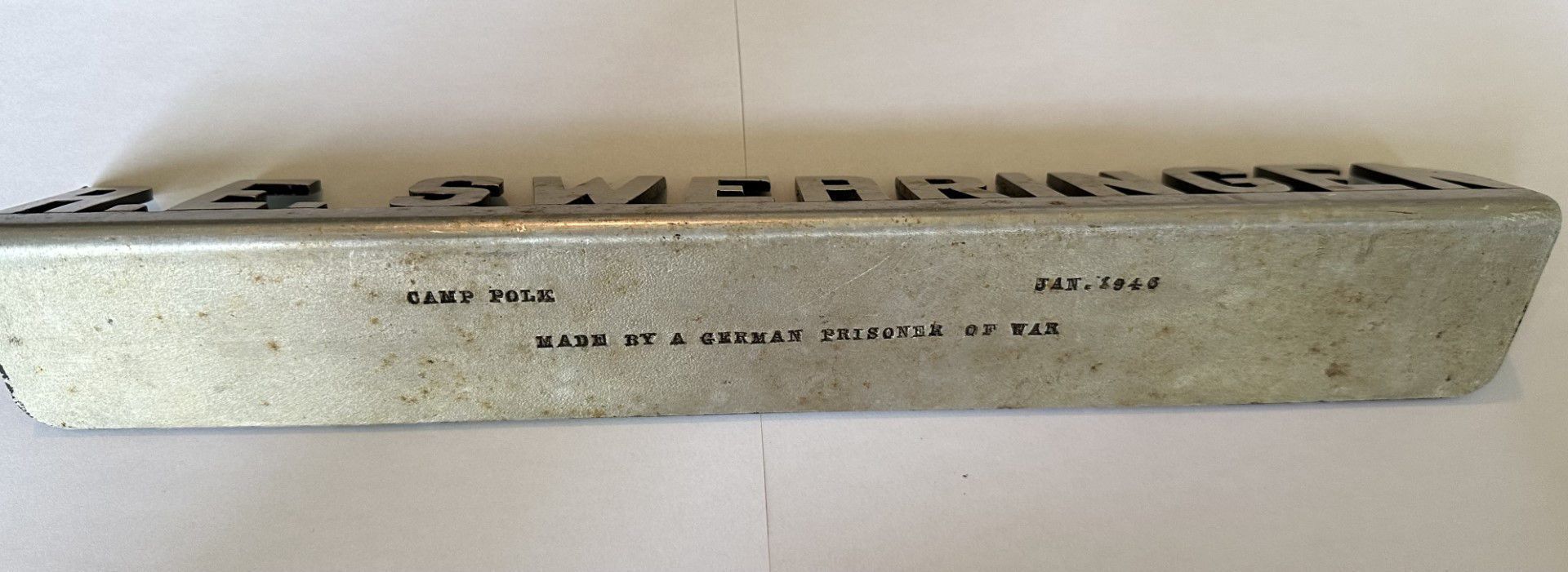 A steel nameplate that was made by a German Prisoner of War (POW) at Camp Polk, Louisiana.Context
