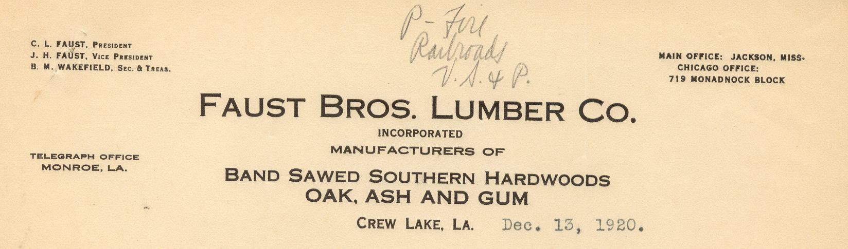 Faust Bros. Lumber Co. began operations in Crew Lake, La. with a focus on developing Band Sawed Hardwood. Crew Lake's resources upon the immense extraction of lumber dried up quickly. C. L. Faust was the President of the Company and his brother J. M. Faust was the Vice President.Collection