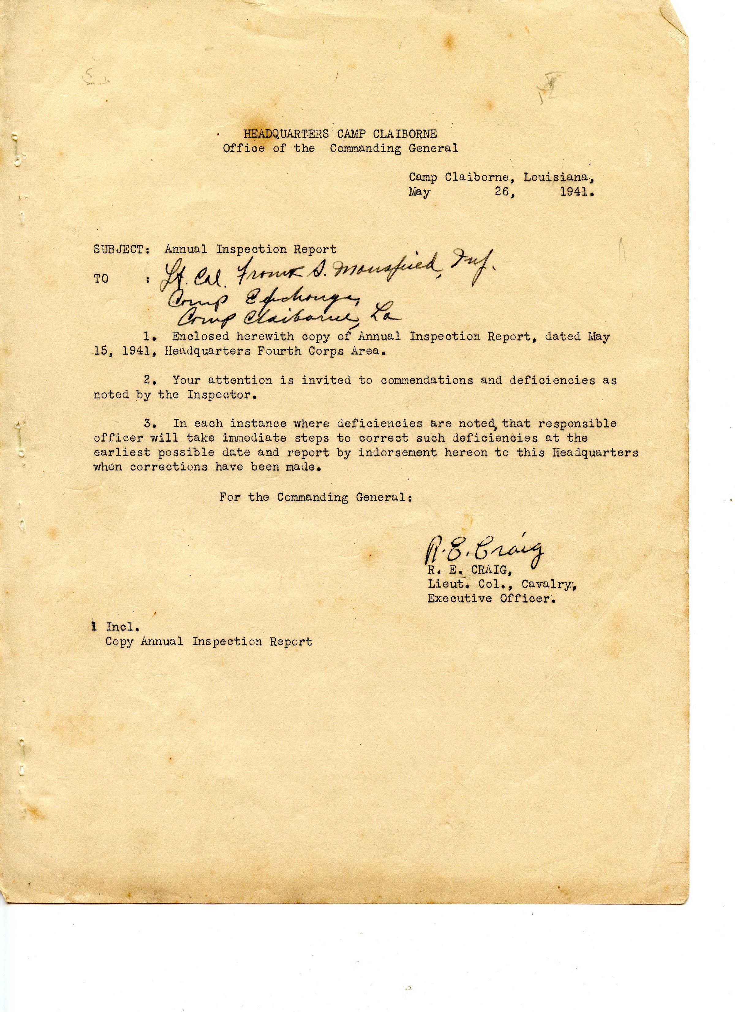 The Annual Inspection Report sent to Camp Claiborne, May 26, 1941.Context