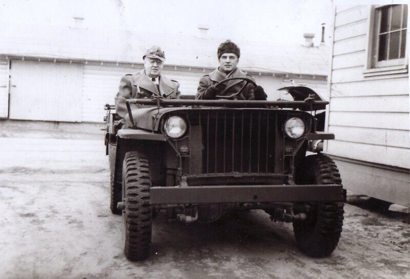 A pair of soldiers ride in a Military Willys Jeep.