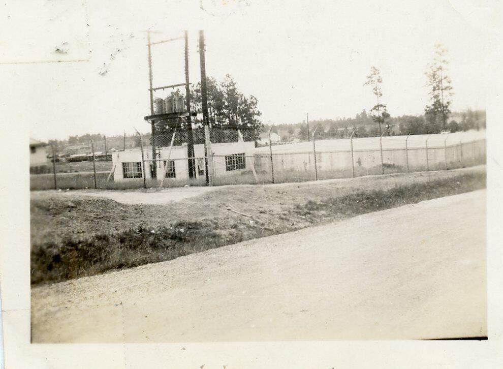 A building sits in a barbed wire hurricane fence in Camp Claiborne