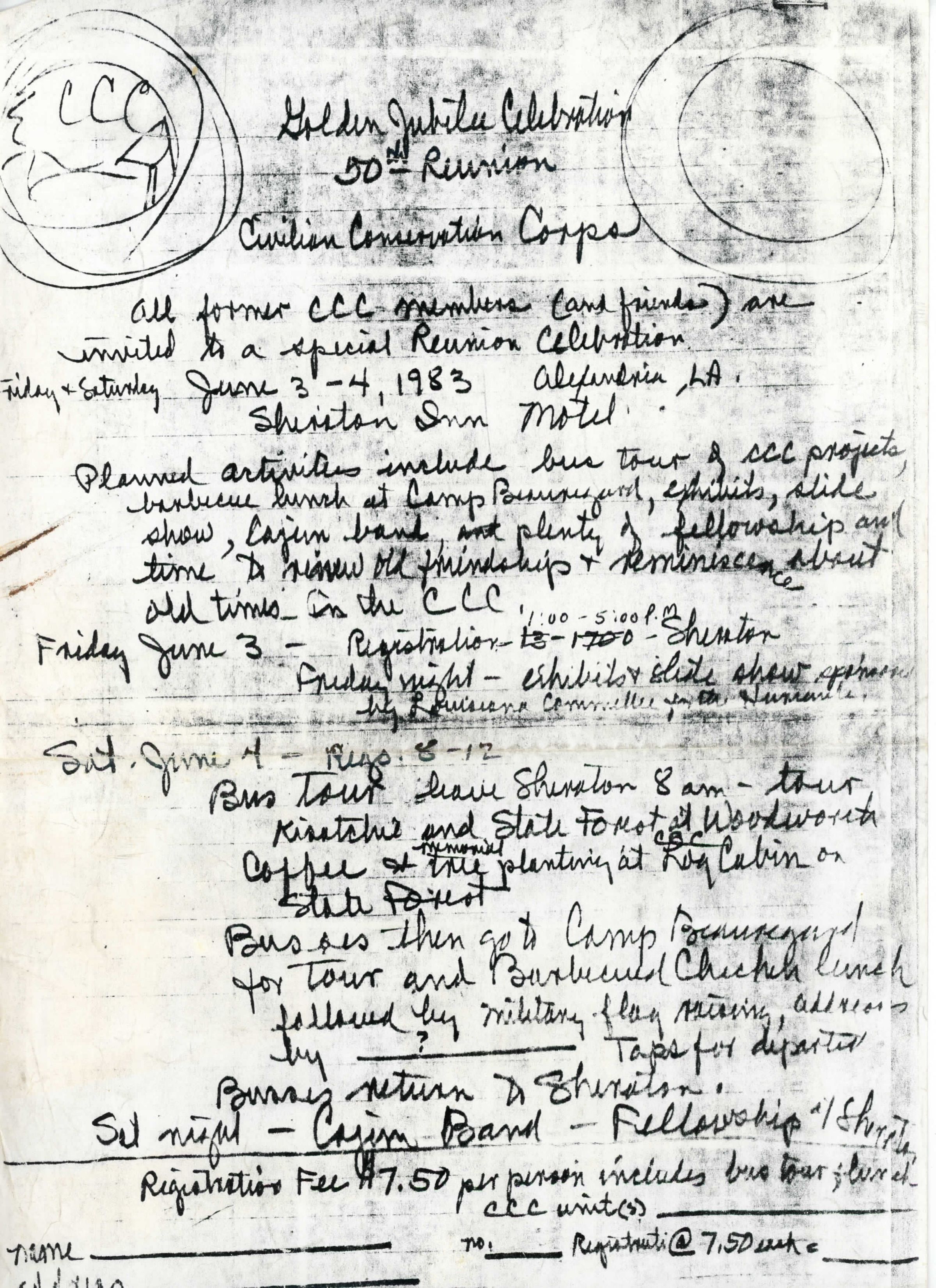 Handwritten draft of the newsletter for the Golden Jubilee Celebration of the 50th Reunion of the CCC; activities planned, how to pay, what was to happen what day, etc. ; Written by Dr. Anna Burns?; newsletter for the 50th reunion of the CCC in June 3-4 1983; in Alexandria, LA at [undecipherable name] Inn MotelCollection