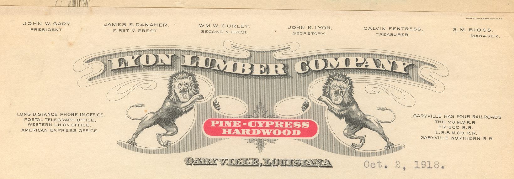 Lyon Lumber Company began operations in Louisiana during 1918 which was the end of WWI. The company specialized in Pine-Cypress Hardwood. However, the company was forced to close down due to resources drying up.Collection