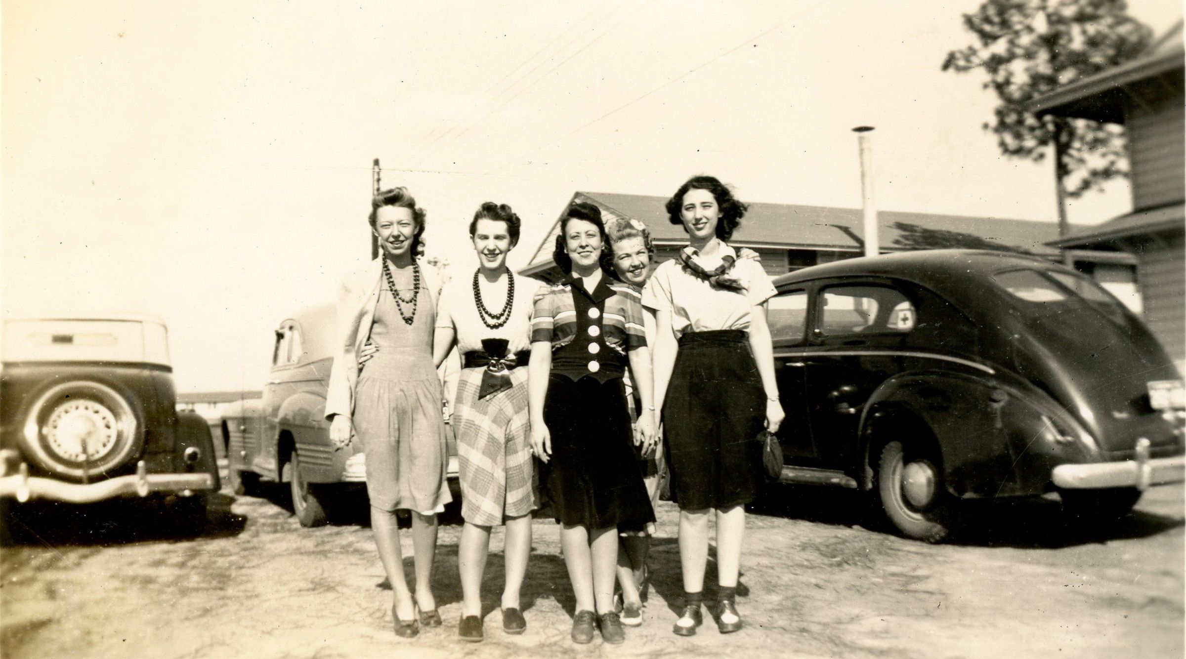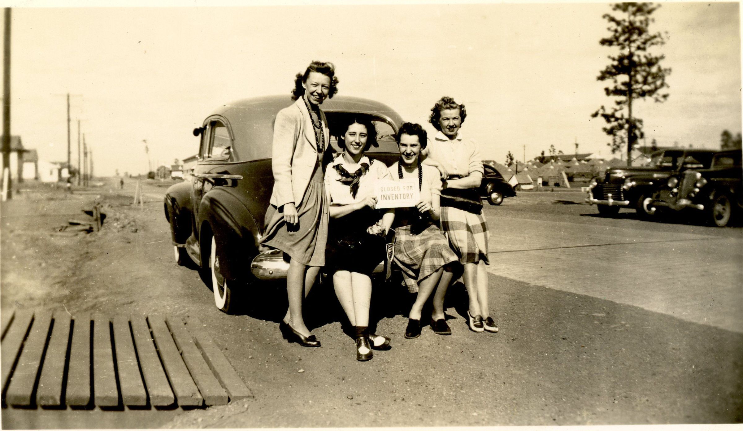 Katherine Baker, Viva Hogon, Audrine Curtis, Alberta Benson & Fenn England on the road posing with automobiles.Photograph Details