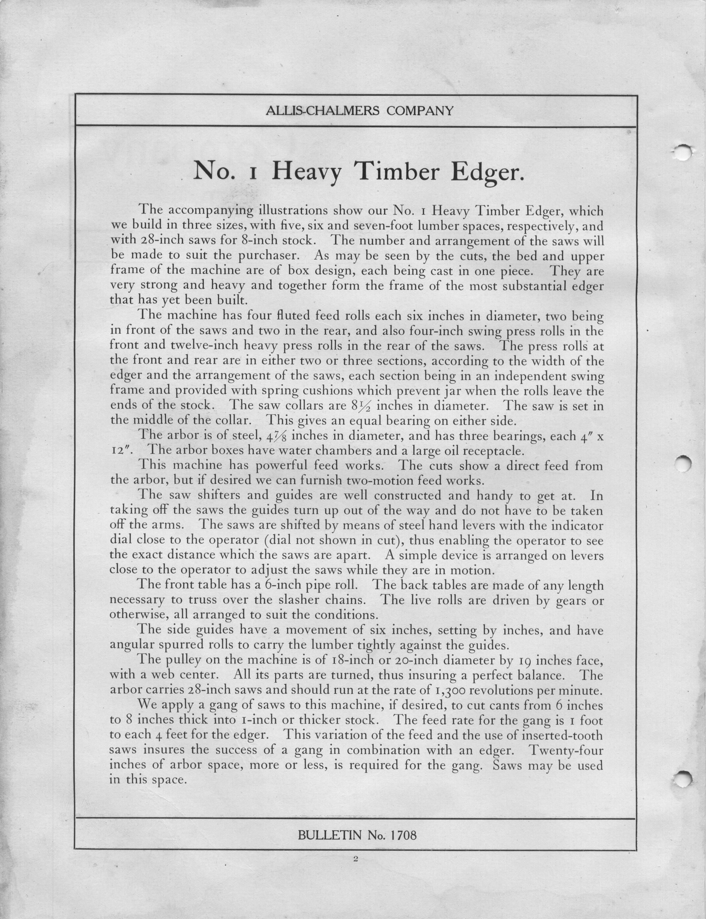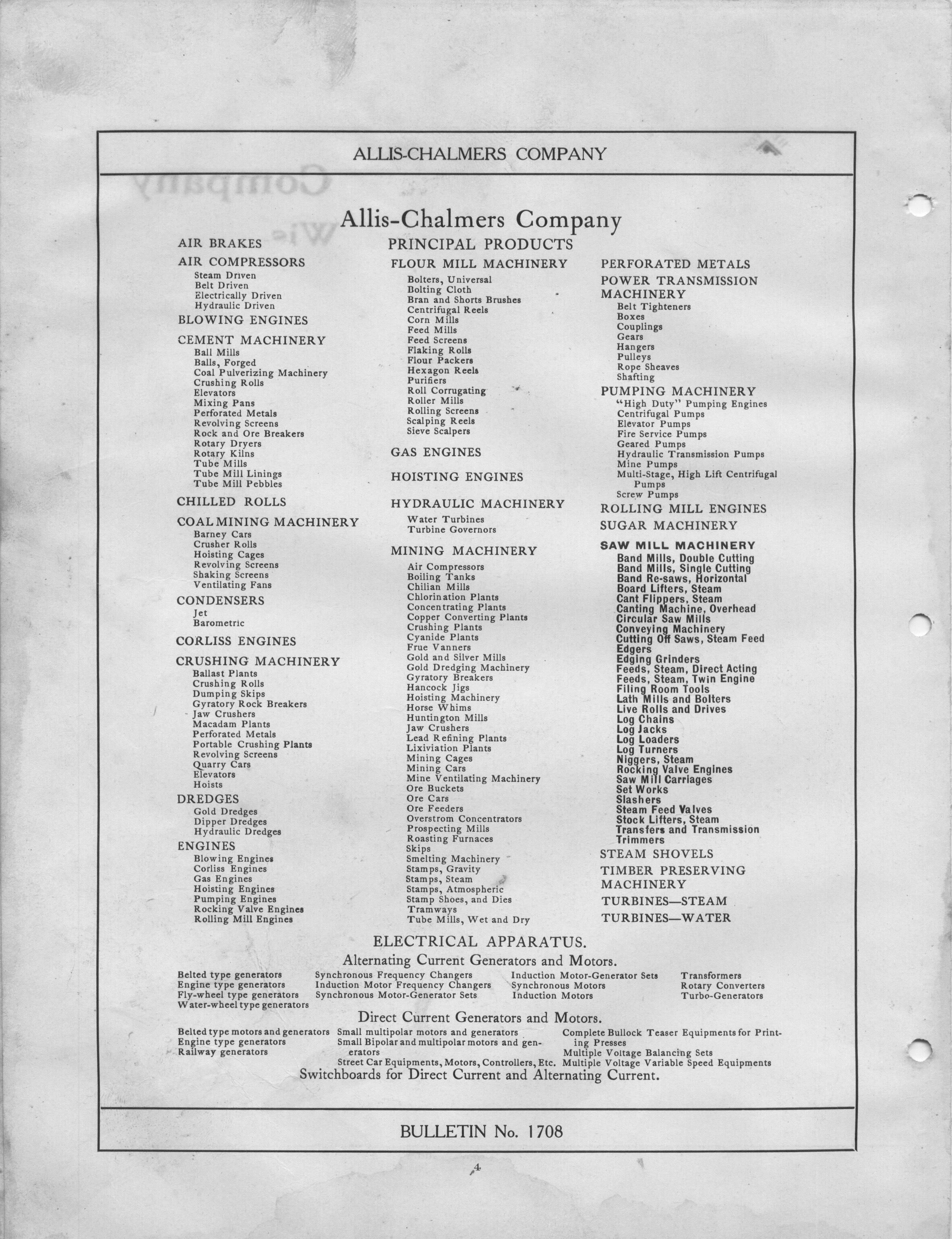 Has equipment of air brakes, air compressors, blowing engines, cement machinery, chilled rolls, coal mining machinery, condensers, Corliss engines, crushing machinery, dredges, engines, electrical apparatus (alternating current, direct current, and switchboards for generators and motors), flour mill machinery, gas engines, hoisting engines, hydraulic machinery, mining machinery, perforated metals, power transmission machinery, pumping machinery, rolling mill engines, sugar machinery, sawmill machinery, steam shovels, timber preserving machinery, turbines-steam, and turbines-water