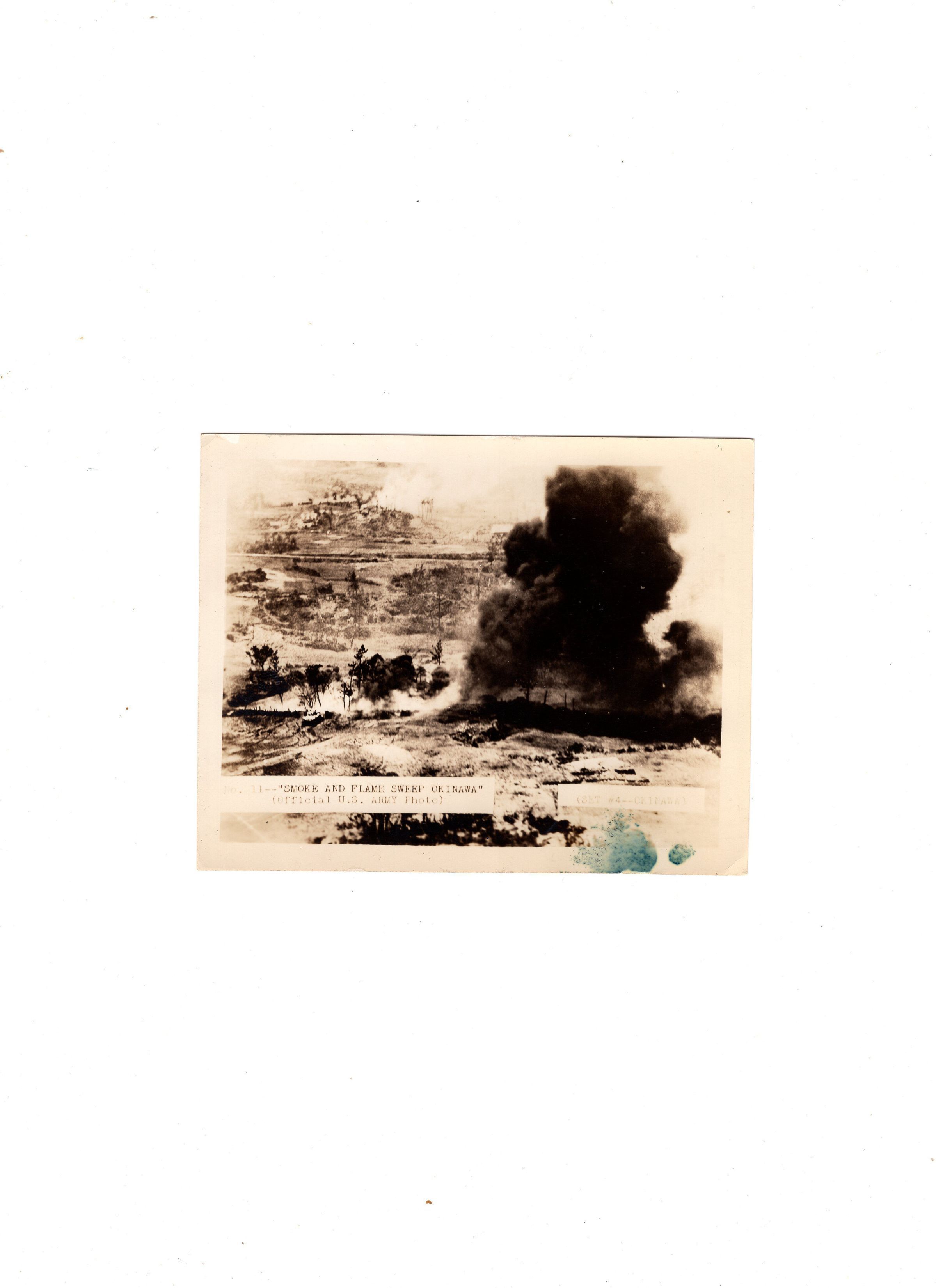 Photo depicts a large cloud of black smoke rising from a tree line on Okinawa during the battle for the island during World War II. The photo is titled "Smoke And Flame Sweep Okinawa" and is designated 'Official U.S. Army Photo" and Set # 4- OkinawaPhotograph Details
