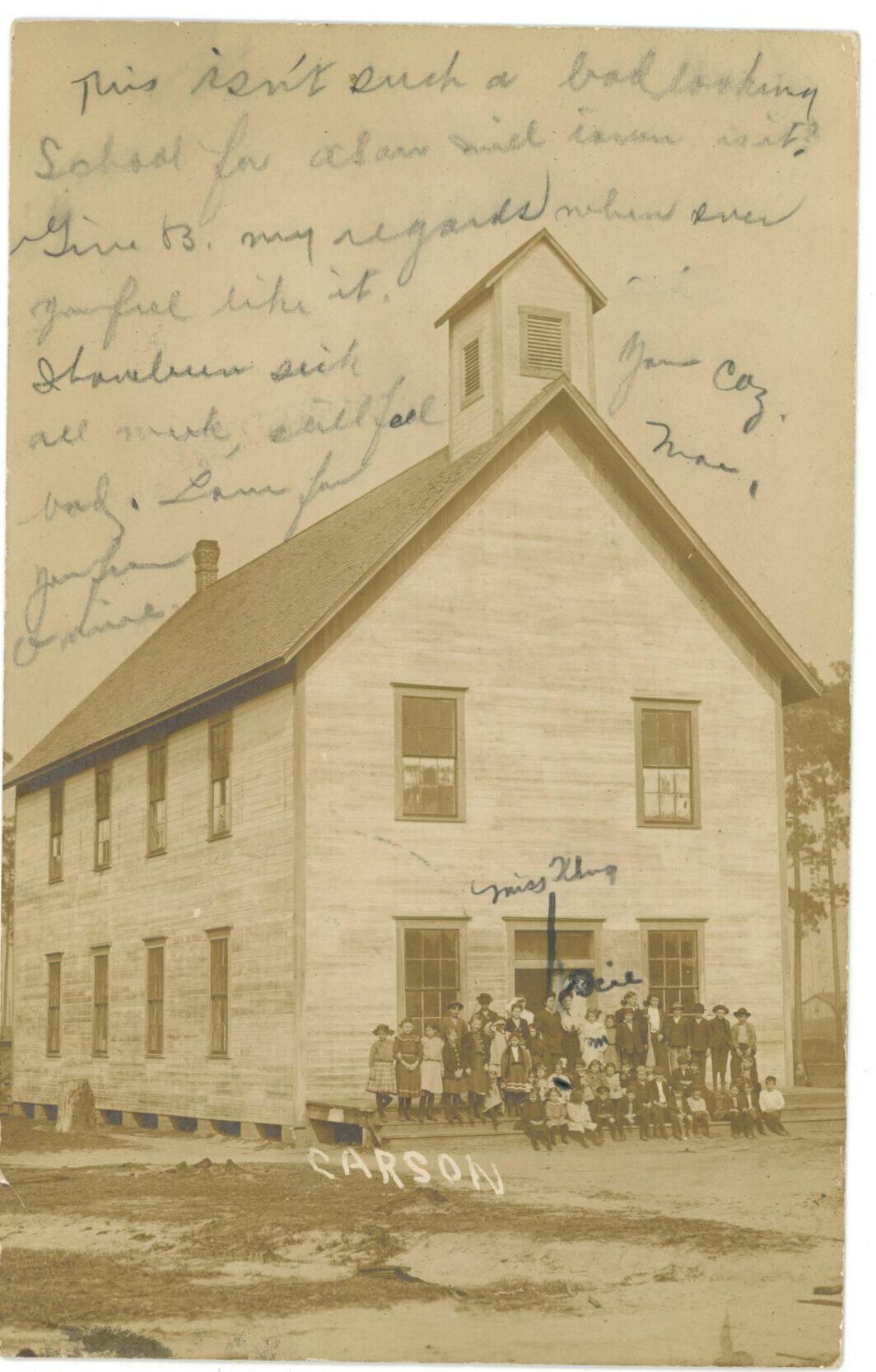 black and white snapshot of the school and its students and teacher in Carson; penciled in the teacher's name and the writer's location with an "m"; from Mae to Miss Edith Dood/s on Feb 9 1909Collection