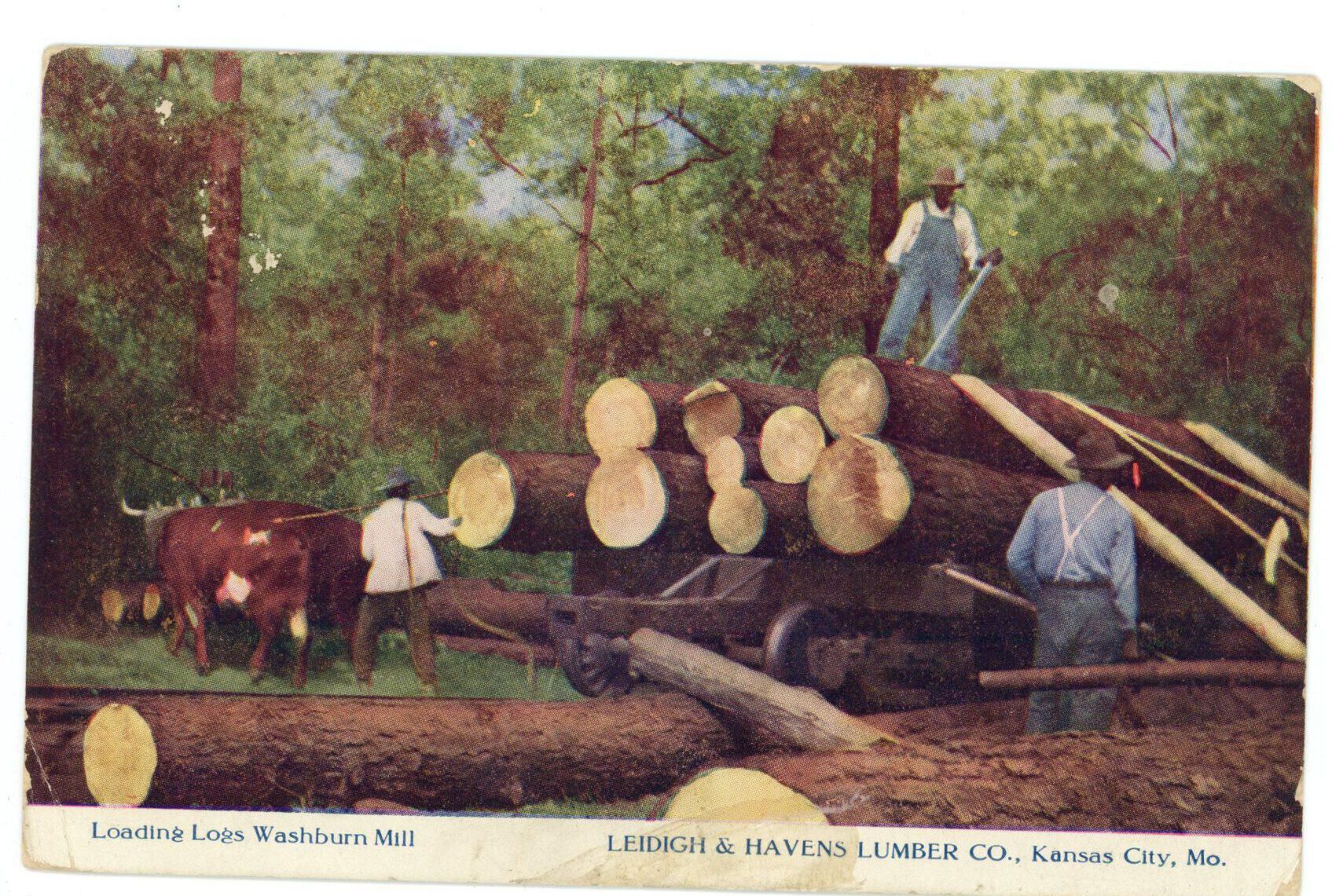 colorized photo of loading logs with bulls at Washburn Mill; sent out by Leidigh & Havens Lumber Co. to Carlock Long Lumber Co. on Jan 6 1910Collection
