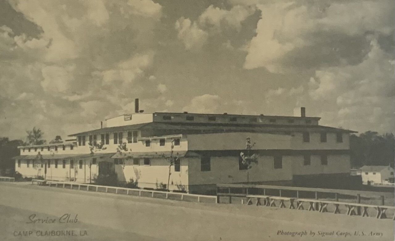 The photograph on the front of the postcard depicts what the Camp Claiborne Service Club looked like during the camp's years of operation.Collection