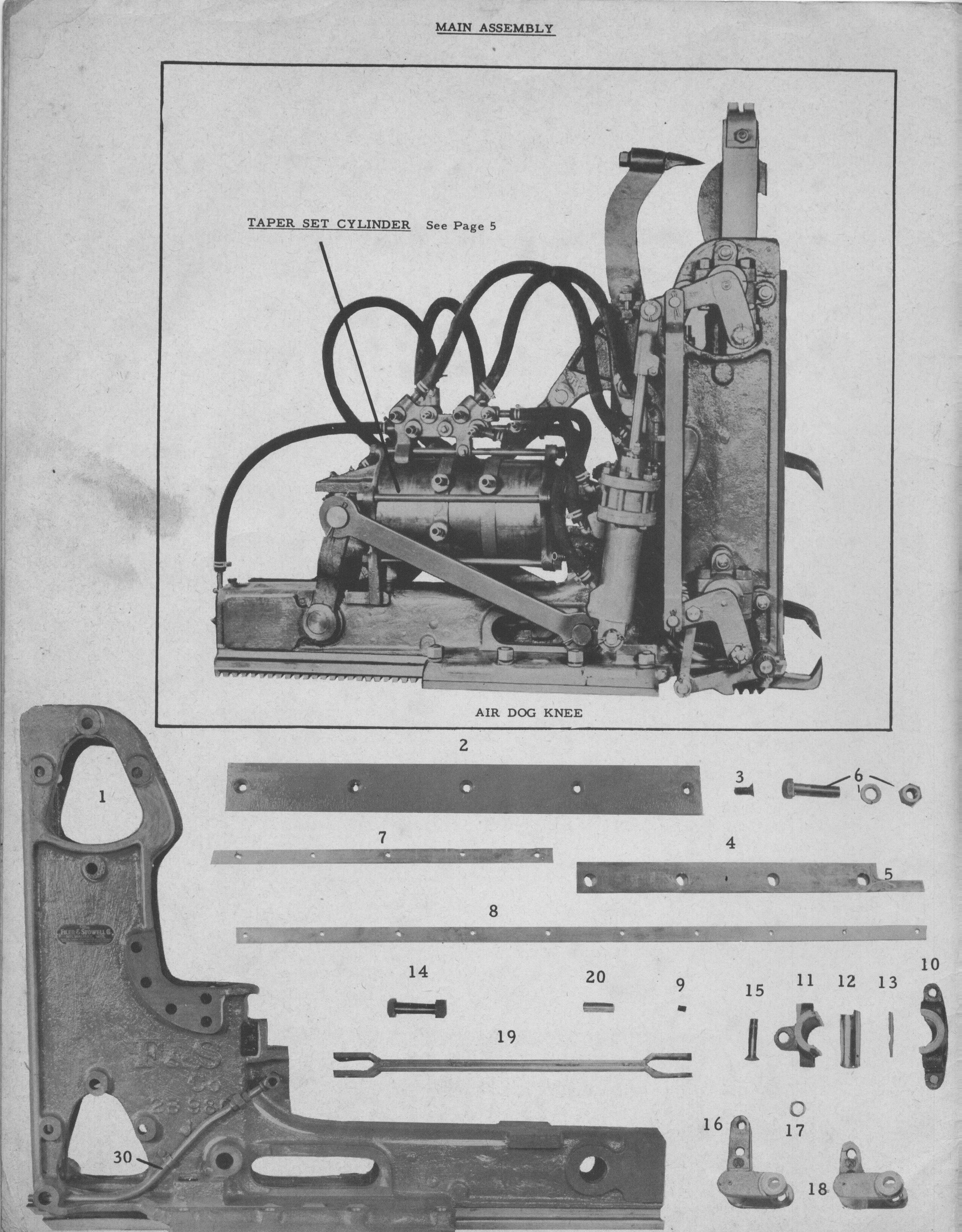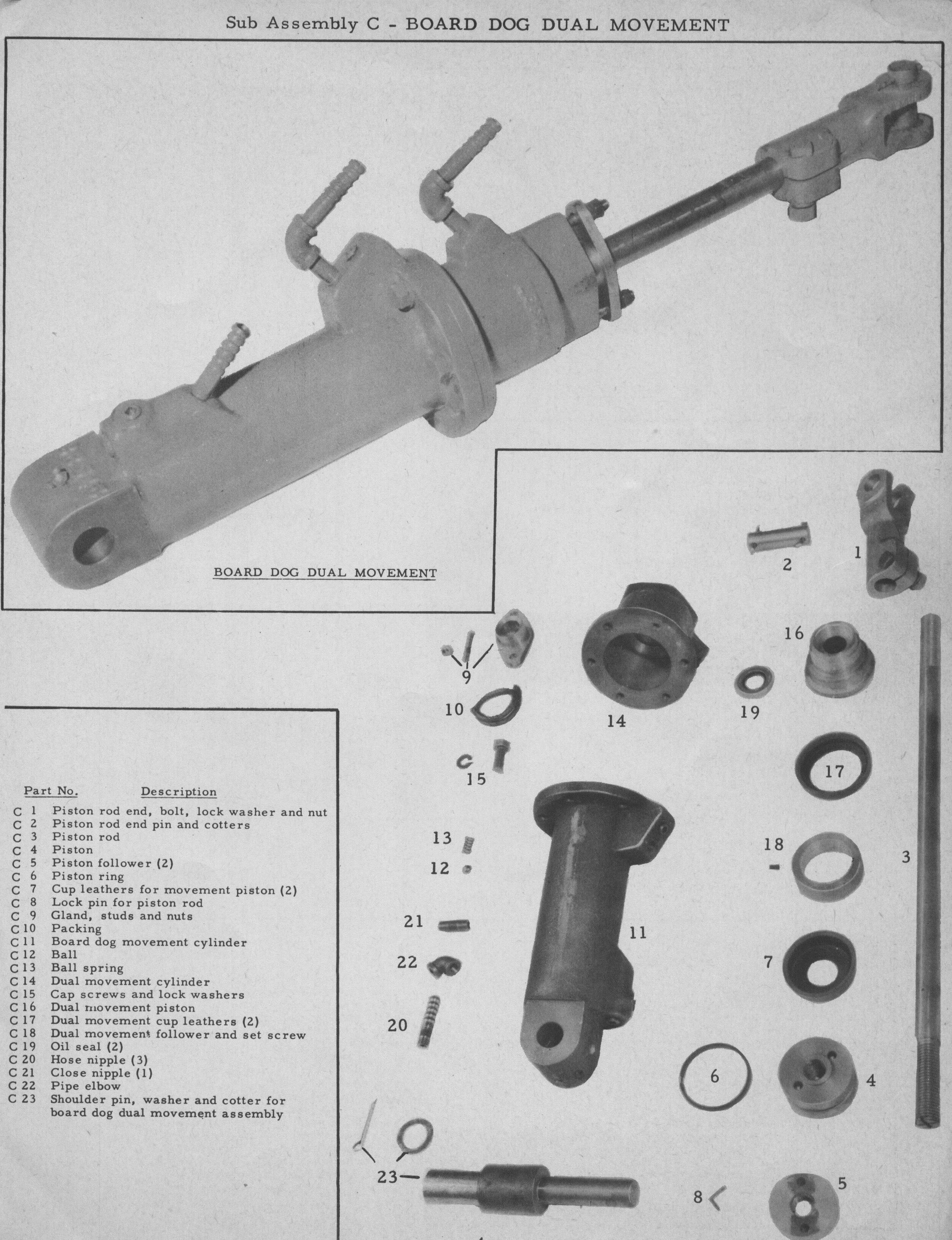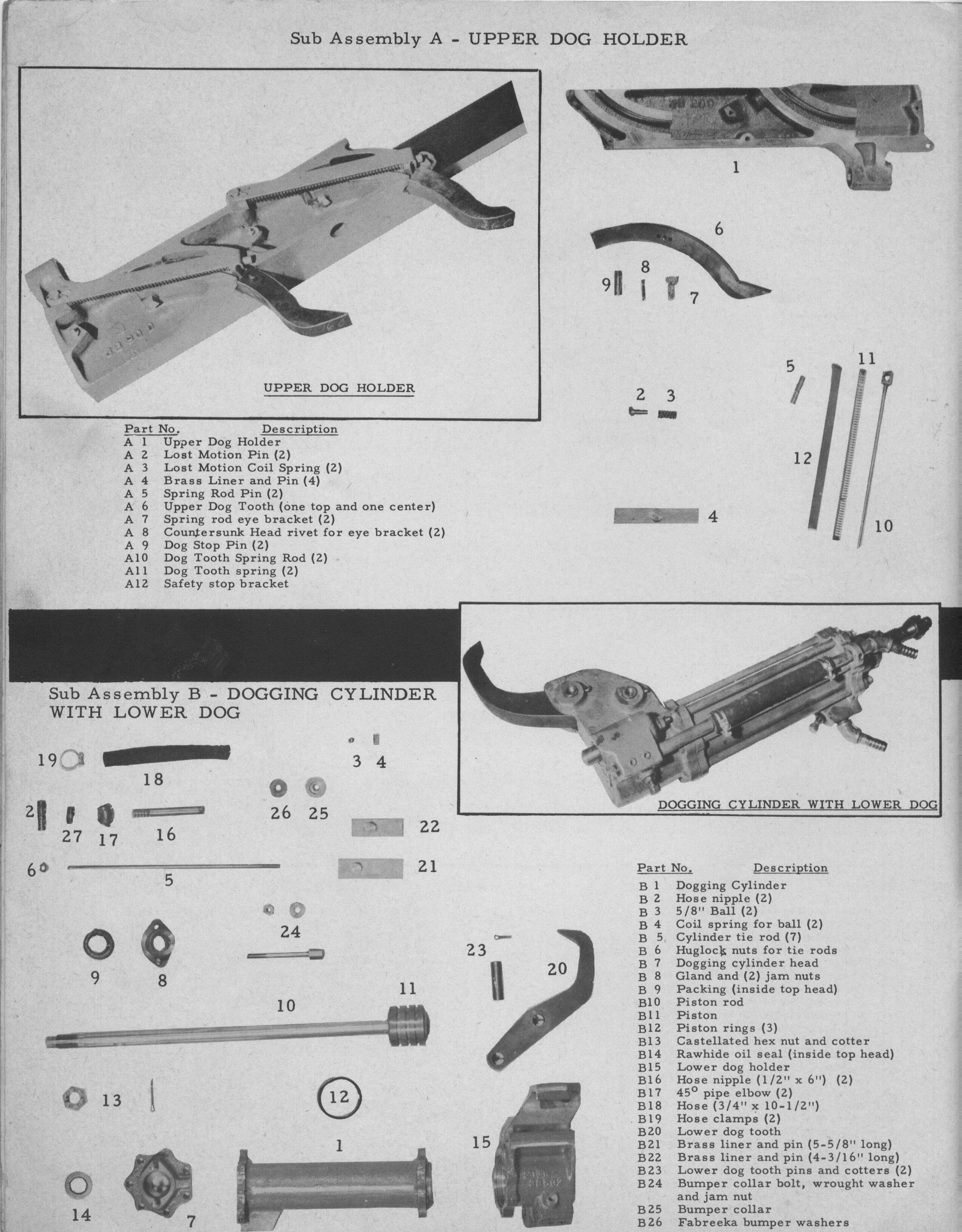 features the assembly parts of the Rack and Pinon Air Dog Carriages: Upper dog holder, Dogging cylinder with lower dog, Board dog movement, taper set cylinder, Full back cylinder, Spring cushion, Hook dog, Chain dog, Hose stand, Single acting poppet valve No. 2B-781, Manifold, and Single acting poppet valve No. 2B-409; then the assembly parts of each of the parts given in the front page of the Rack and Pinon Air Dog CarriagesContext