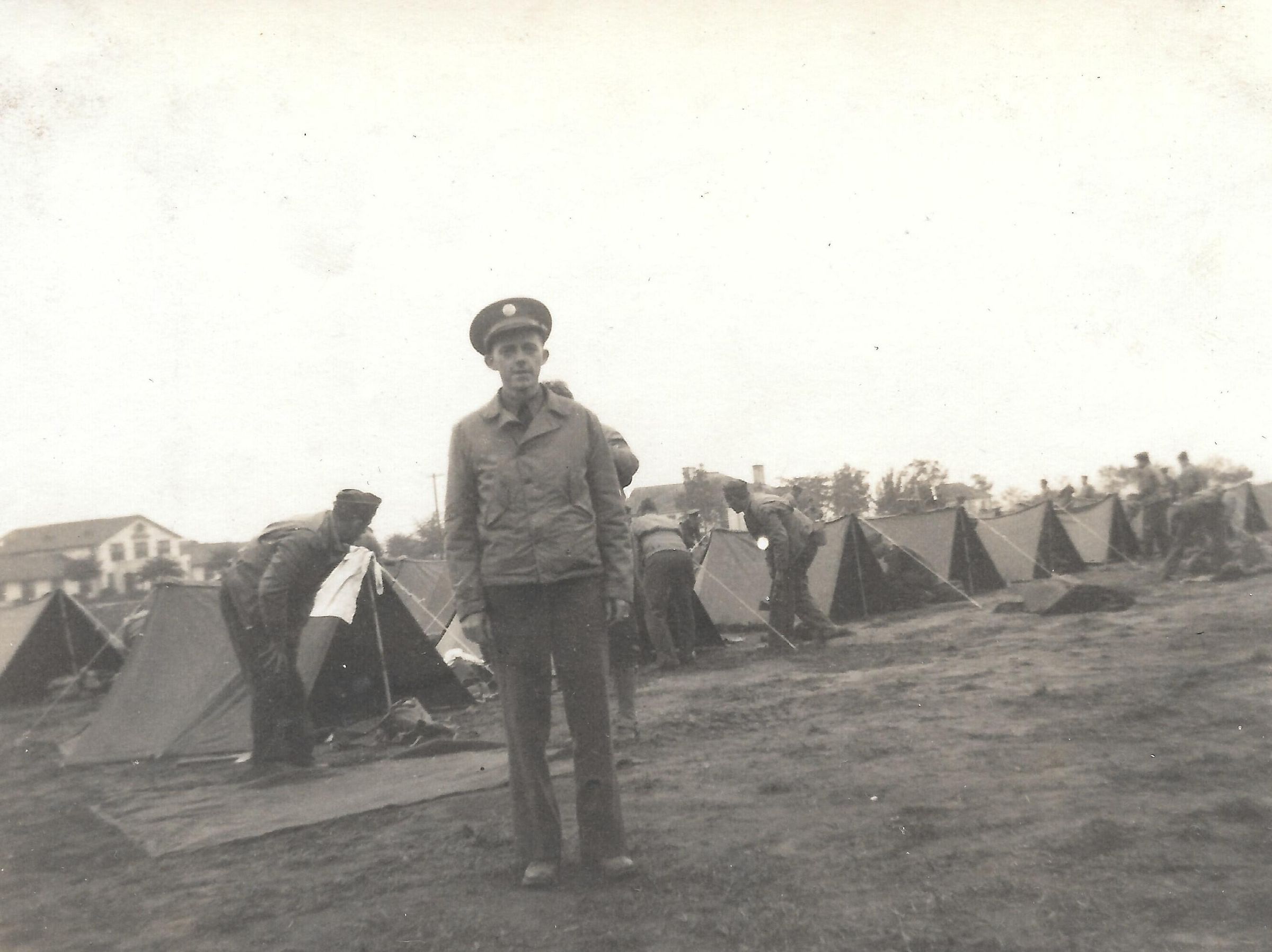 Shows a soldier standing for a photo after the work of constructing his pup tent