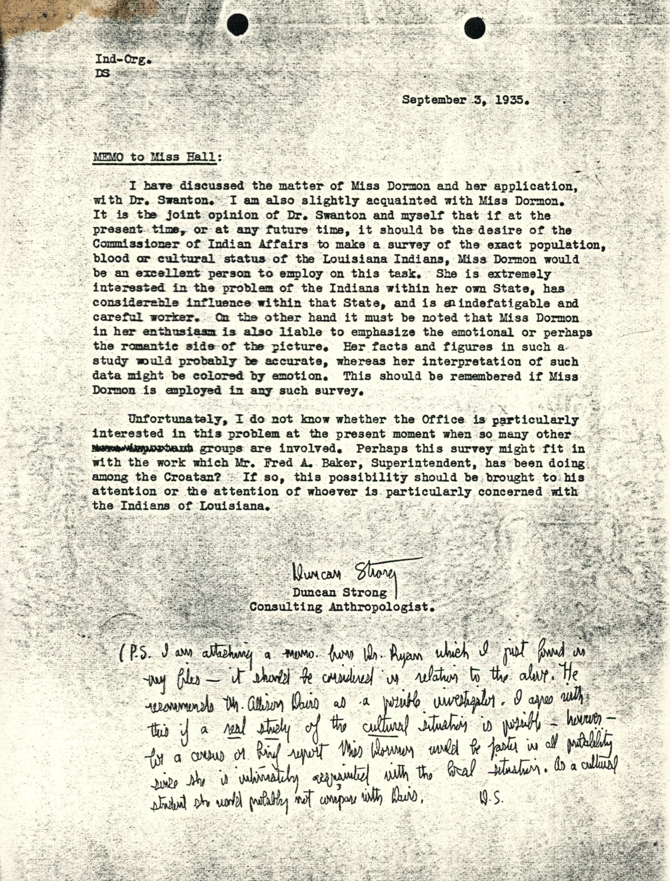 Strong writes of what Caroline Dormon wishes to do with the LA native peoples; he does recommend her in helping with the survey for the Indian Affairs but warns that Dormon is emotionally involved with tribes and will be biased; but Strong understands that maybe this may not happenCreator