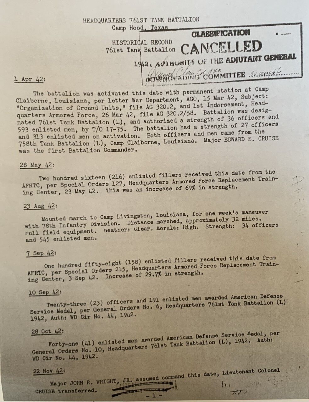 The 761st Tank Battalion was activated at Camp Claiborne, Louisiana on 1 April, 1942. The battalion was designated to have 36 officers and 593 enlisted men, but only had 27 officers and 313 enlisted men at the time of activation. This historical record lists the different actions the battalion took during late 1942.Context