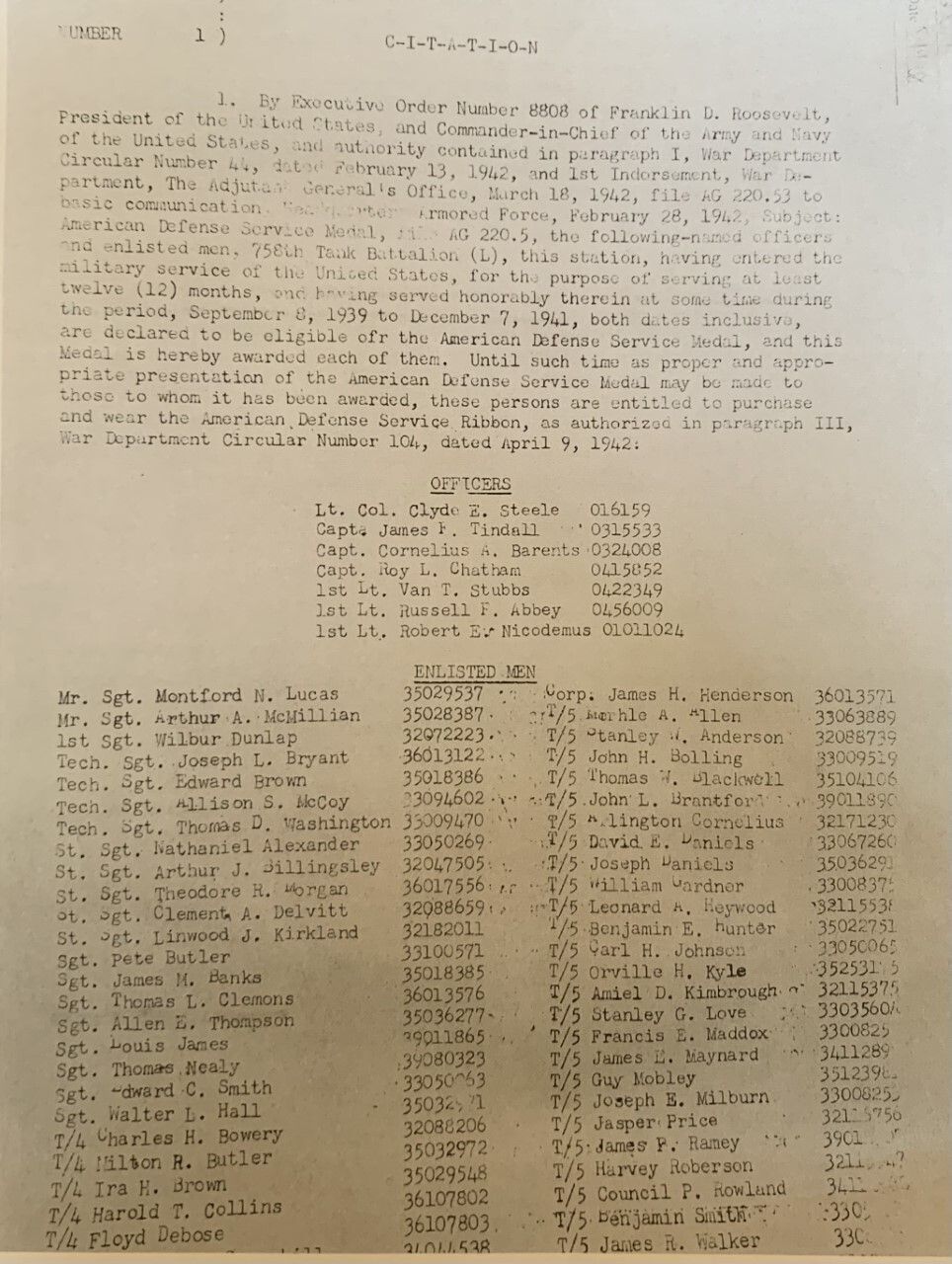 This item is a printer copy of the original records from the 761st Tank Battalion Headquarters.Collection