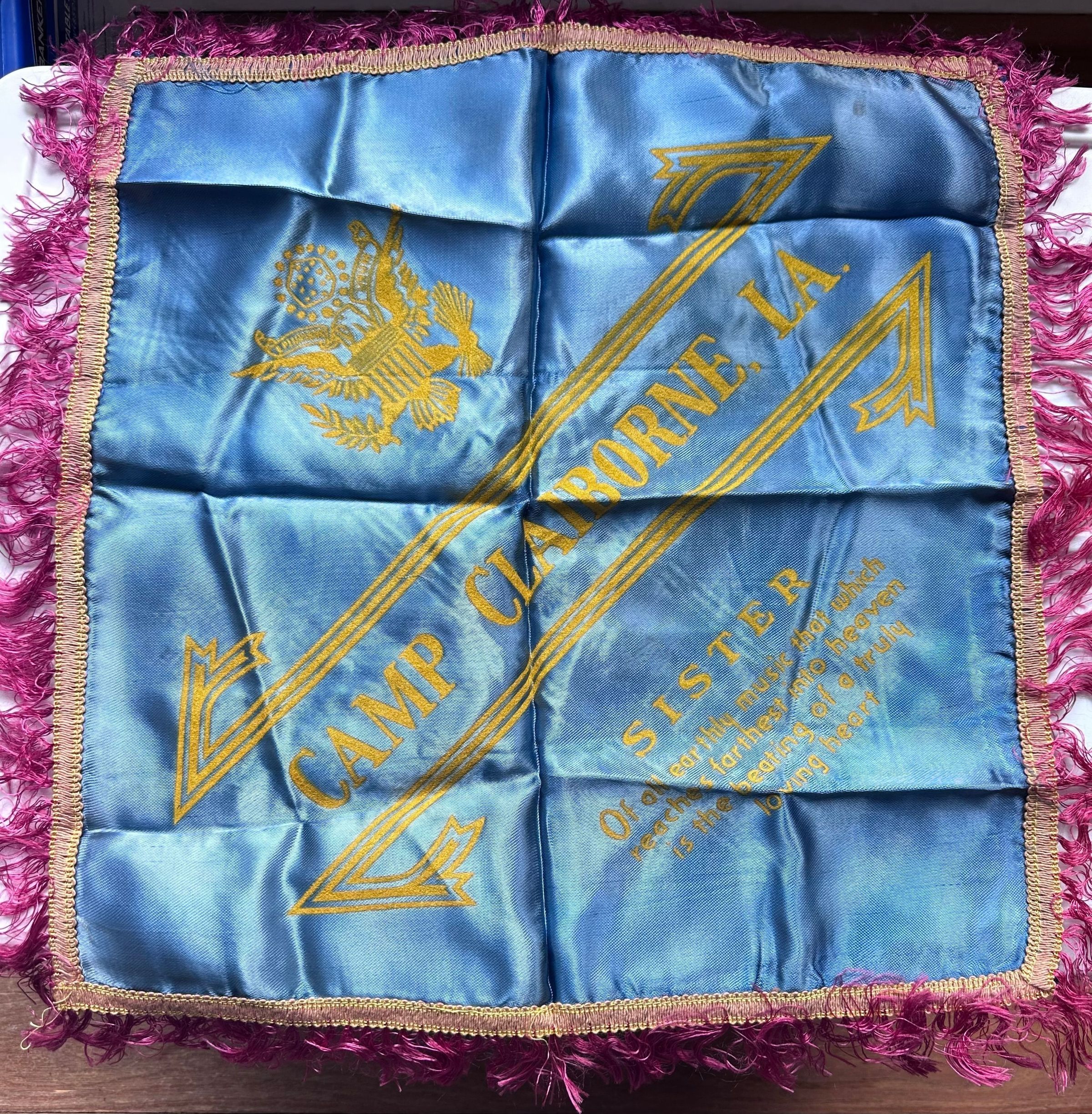 Camp Claiborne WW2 Pillow Cover for a Soldier's sister donated by Peggy Horner