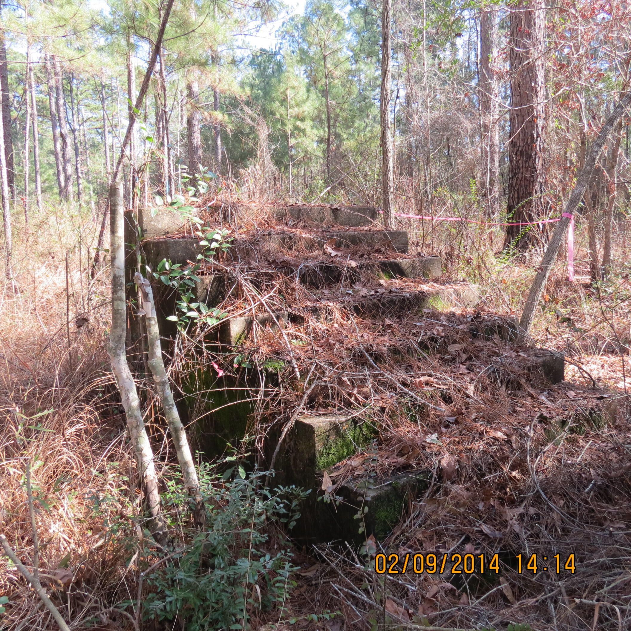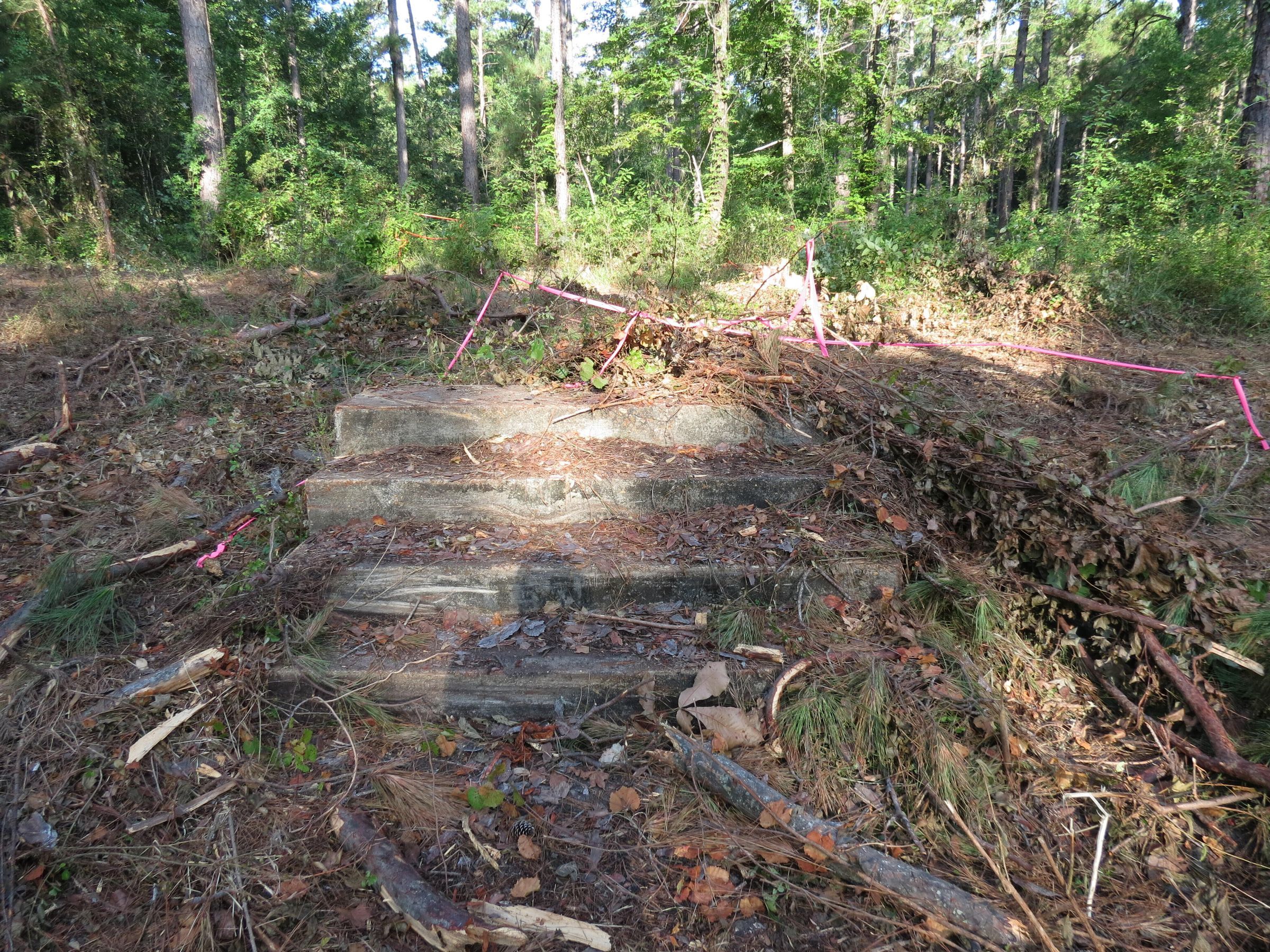 the ruined of the recreation building at Camp Claiborne; beside; behind the main service club; foundation of the rec building; the steps into rec building (behind service club); a washed out road in frontPhotograph Details