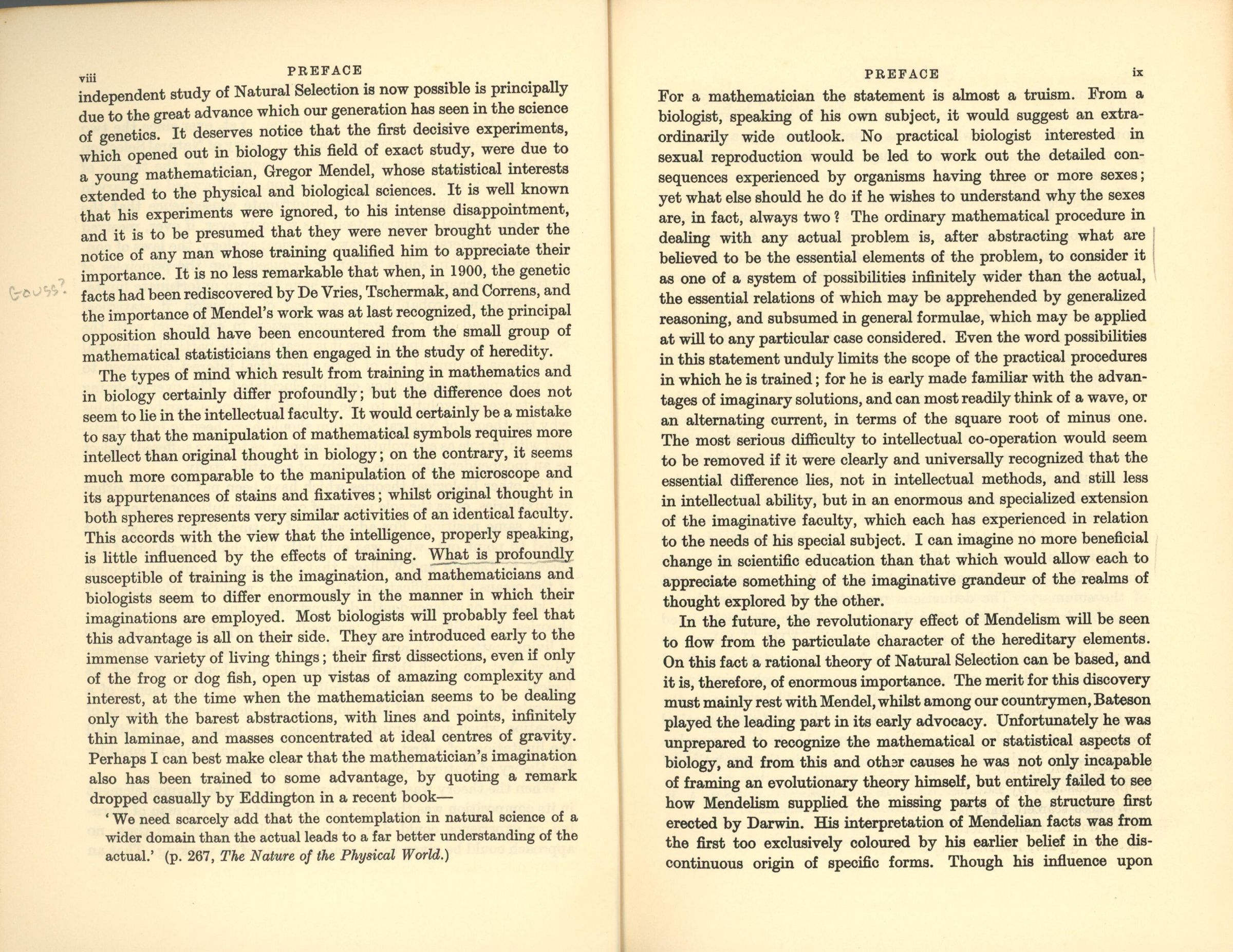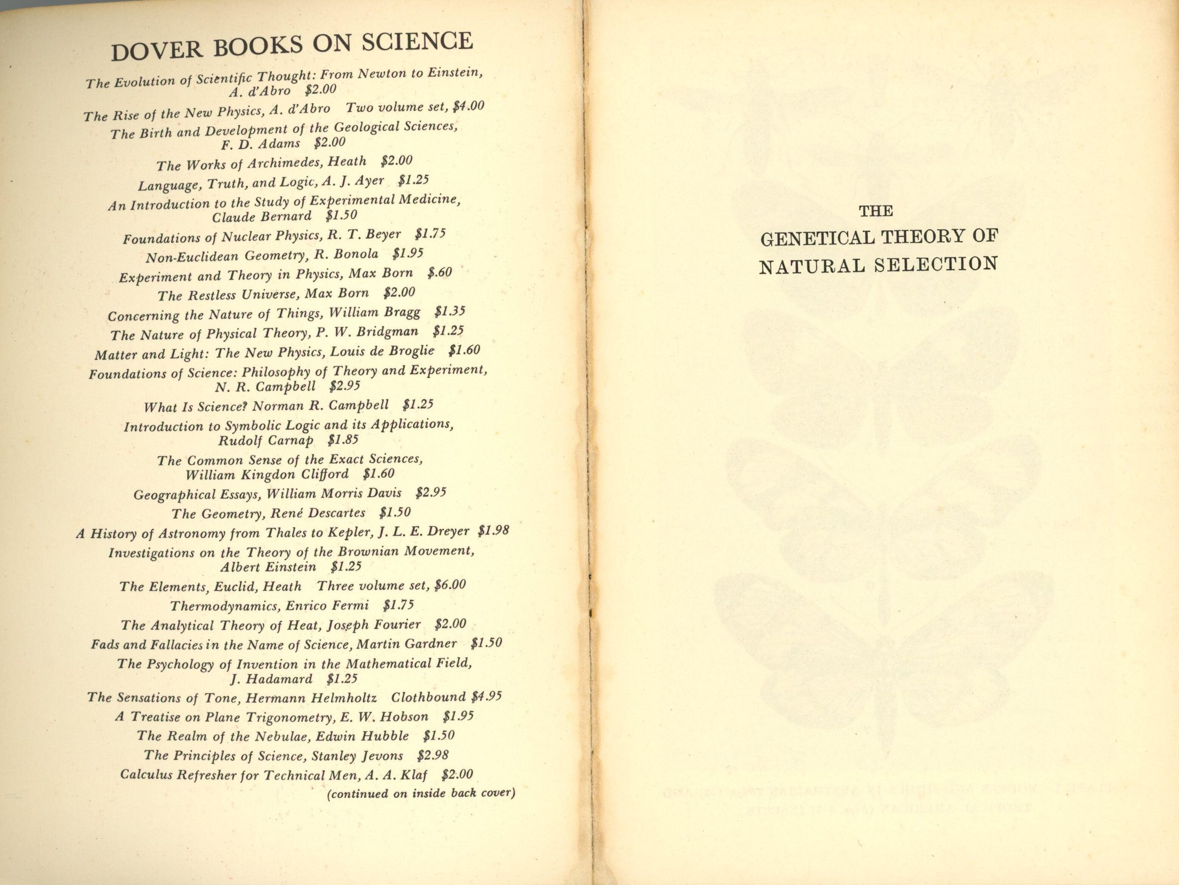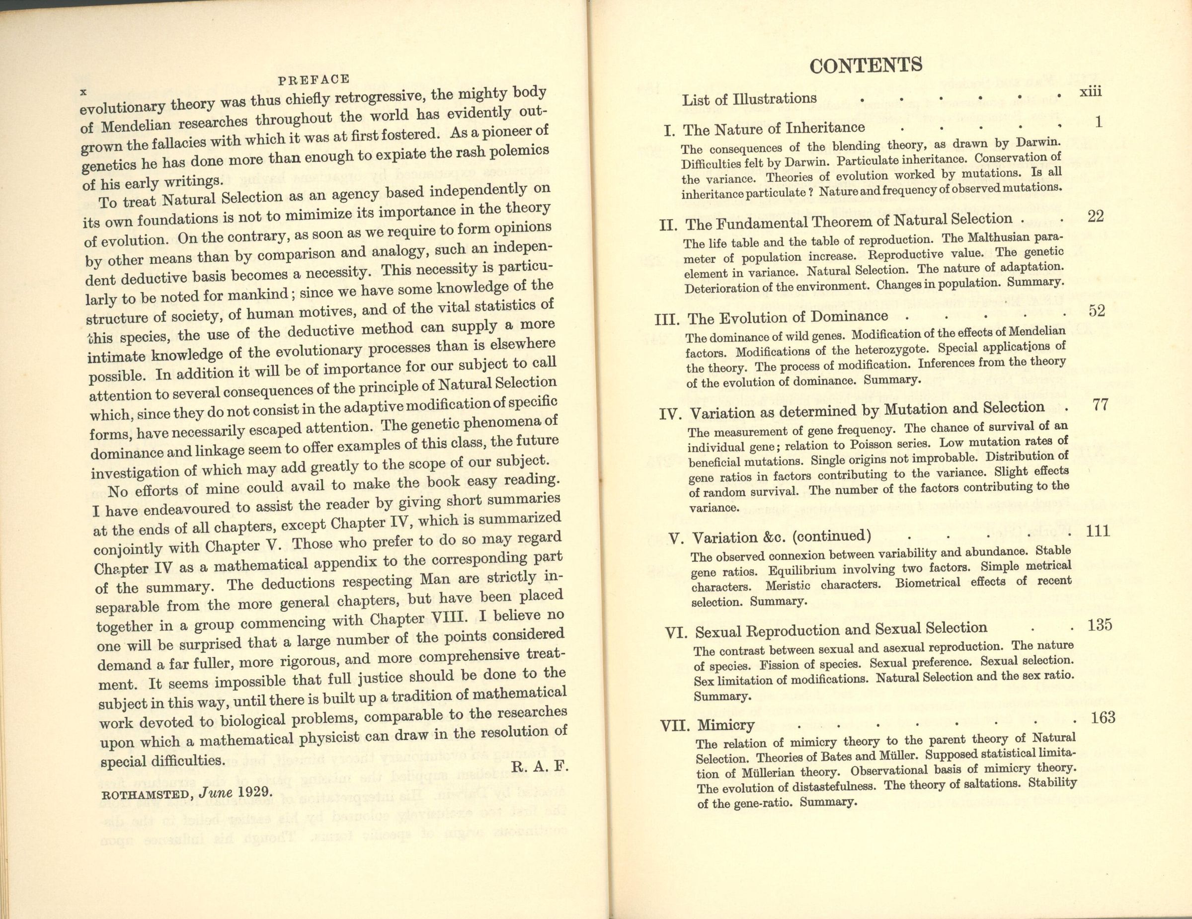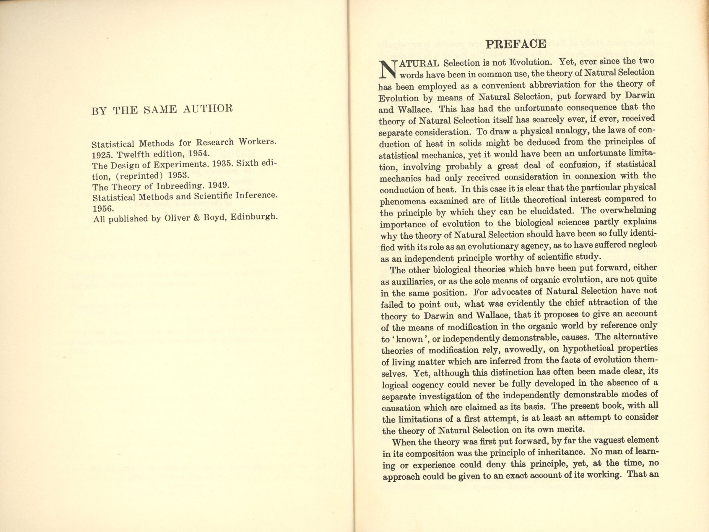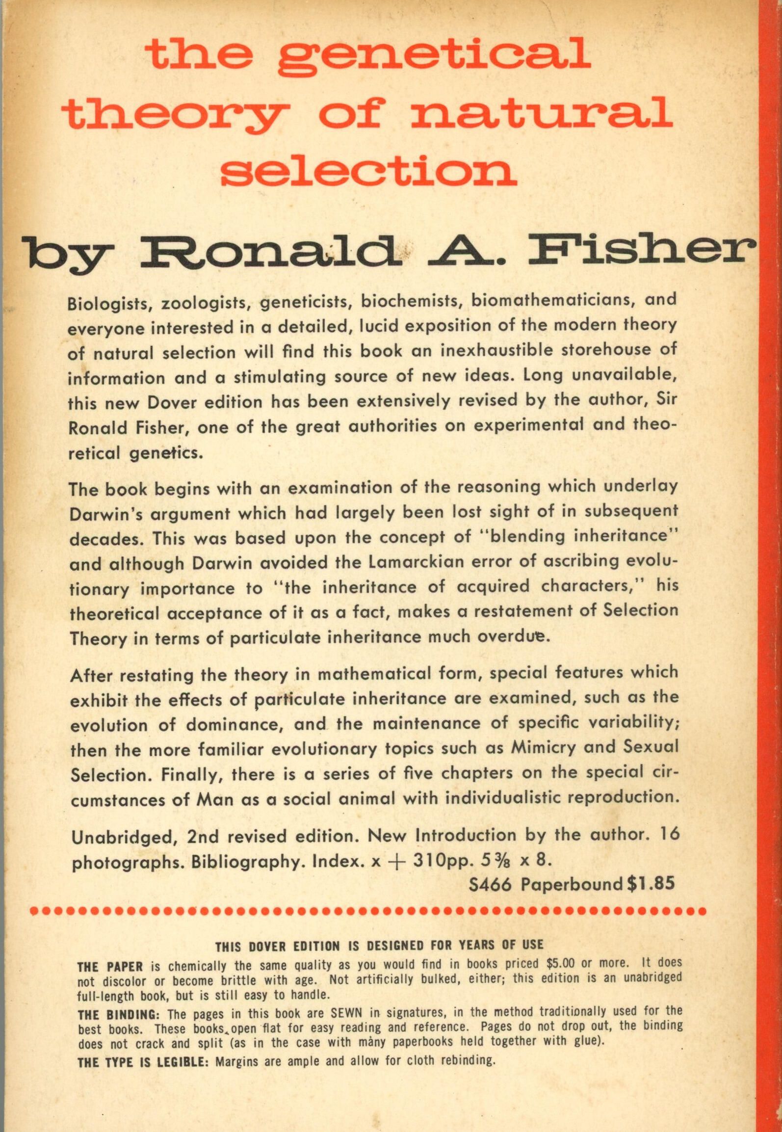 proposes the genetical theory of natural selection, a modern theory; looks at Charles Darwin's argument of the selection theory of blending inheritance