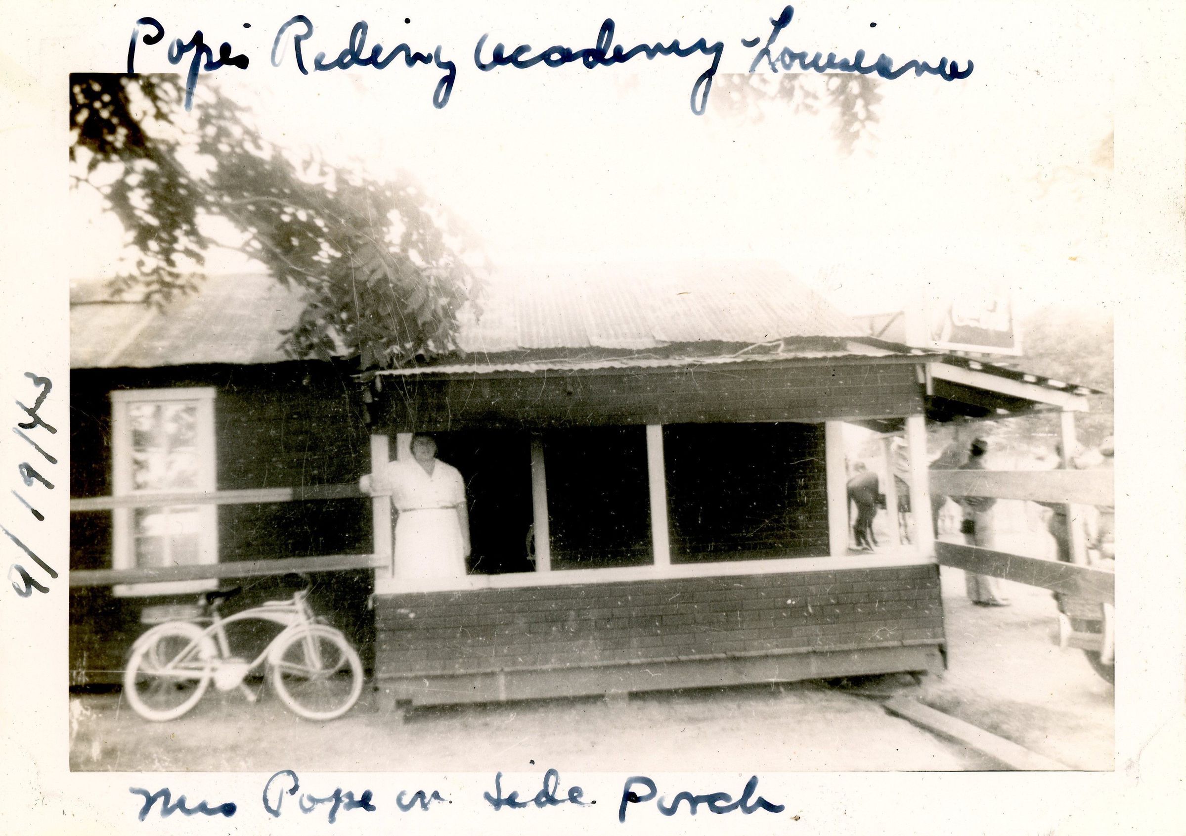 Photo of Mrs Pope on the side porch as stated by handwritten inscriptions at Pope Riding Academy, Louisiana, September 19, 1943Photograph Details