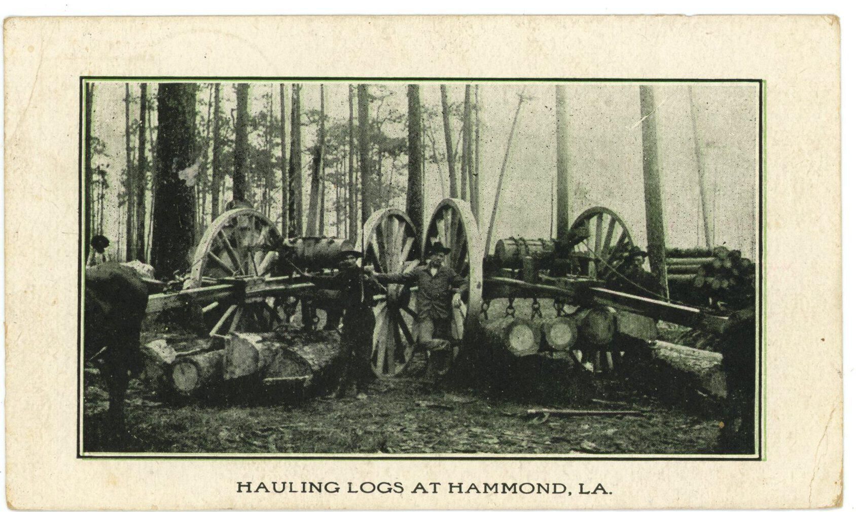 black and white snapshot of logging scene near Hammond; two horse drawn loggers hauling logs; sent to Mr. William Dovette on Oct 1 1906Collection