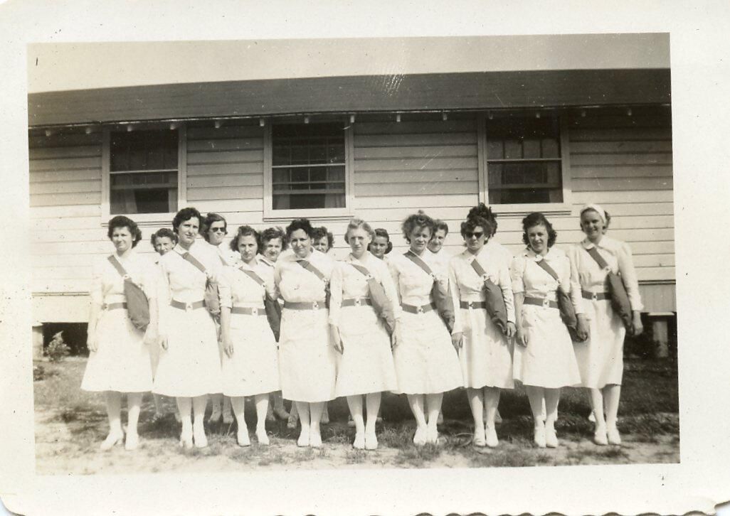 Nurses stand in rows outside of the nurses barracks with their gas masks slung over their shoulder, possibly in a form of exercise for readinessPhotograph Details