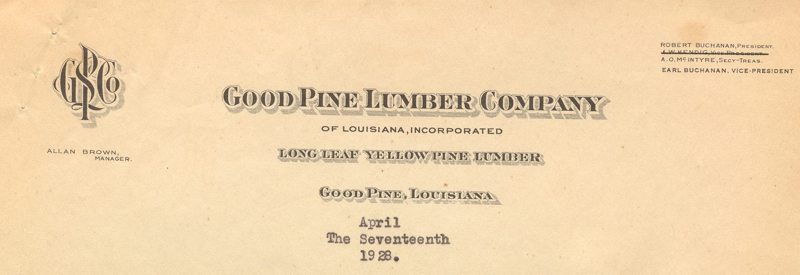 Good Pine Lumber Company began operations in Good Pine, Louisiana. The company specialized in the production of Yellow Pine Lumber. However, the company was forced to shut down due to local resources drying up.Collection