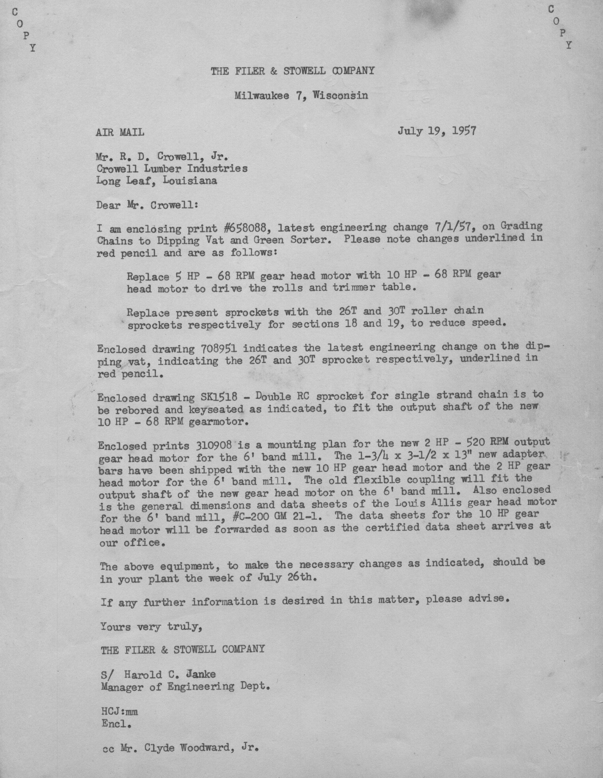 had enclosed drawing of equipment that have had changes made to them; probably being built for the Crowell Lumber Industries; a engineering change on the Grading chain to Dipping vat and Green sorter; mounting plans for the 2 HP -520 RPM output gear head motor for the 6' band mill; this equipment should be delivered by Jul 26; signed by Harold C. Janke manager of engineering dept. of Filer & Stowell Co.Creator