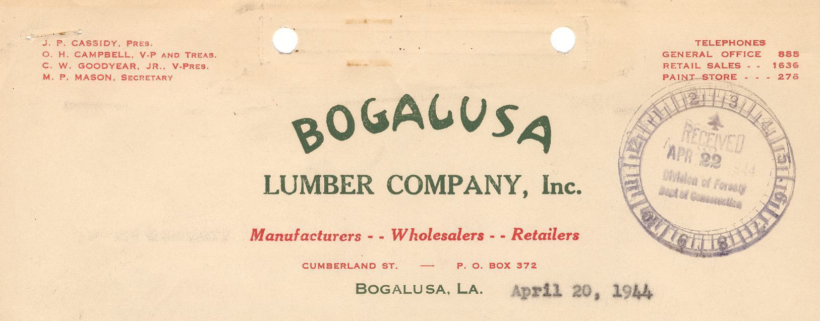 Letterhead from Bogalusa Lumber Company, Inc. April 20, 1944.Context