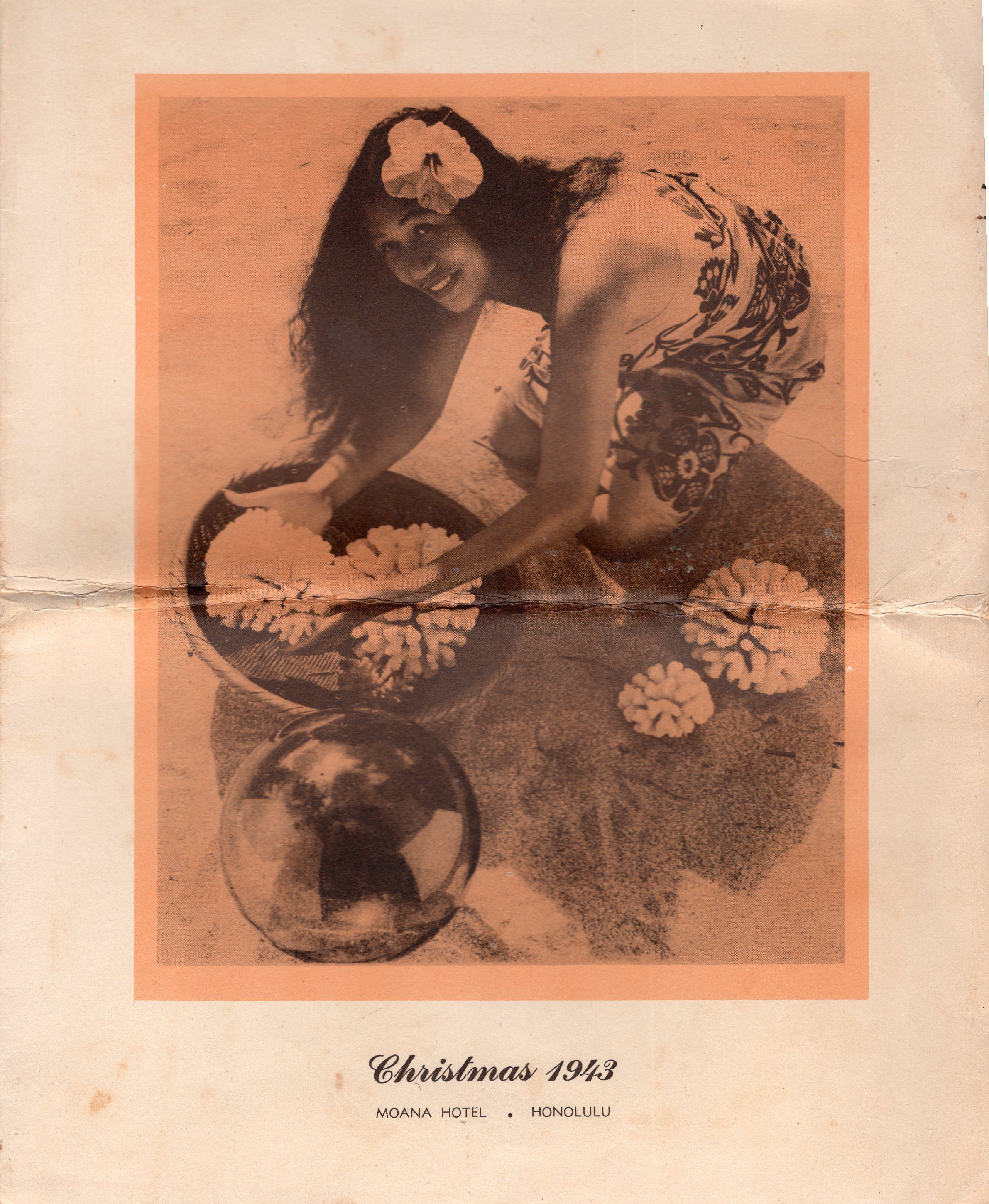 Menu from the Moana Hotel in Honolulu, Hawaii listing the meals to be served for Christmas Dinner in 1943. Menu contains photo of a Hawaiian woman on the front and an image of the hotel, as well as a list of the meals being served.Collection