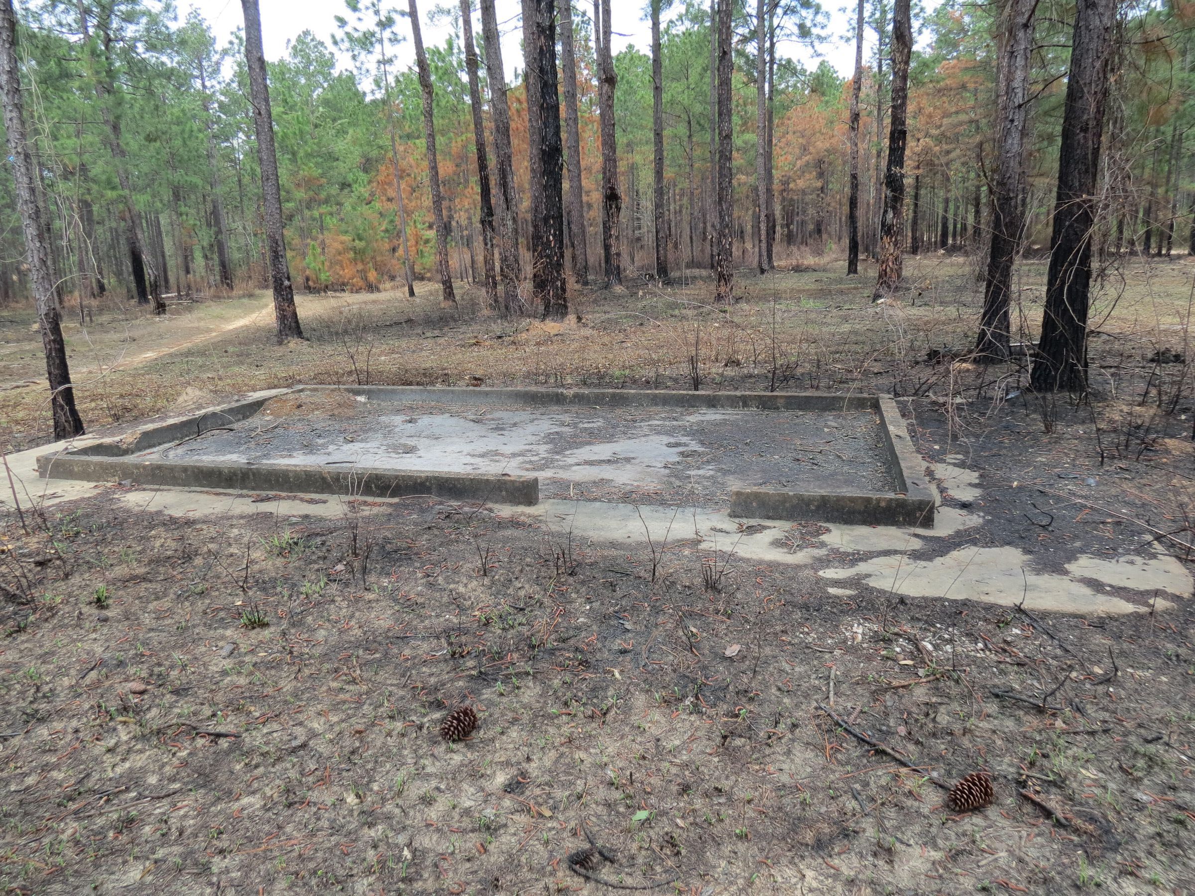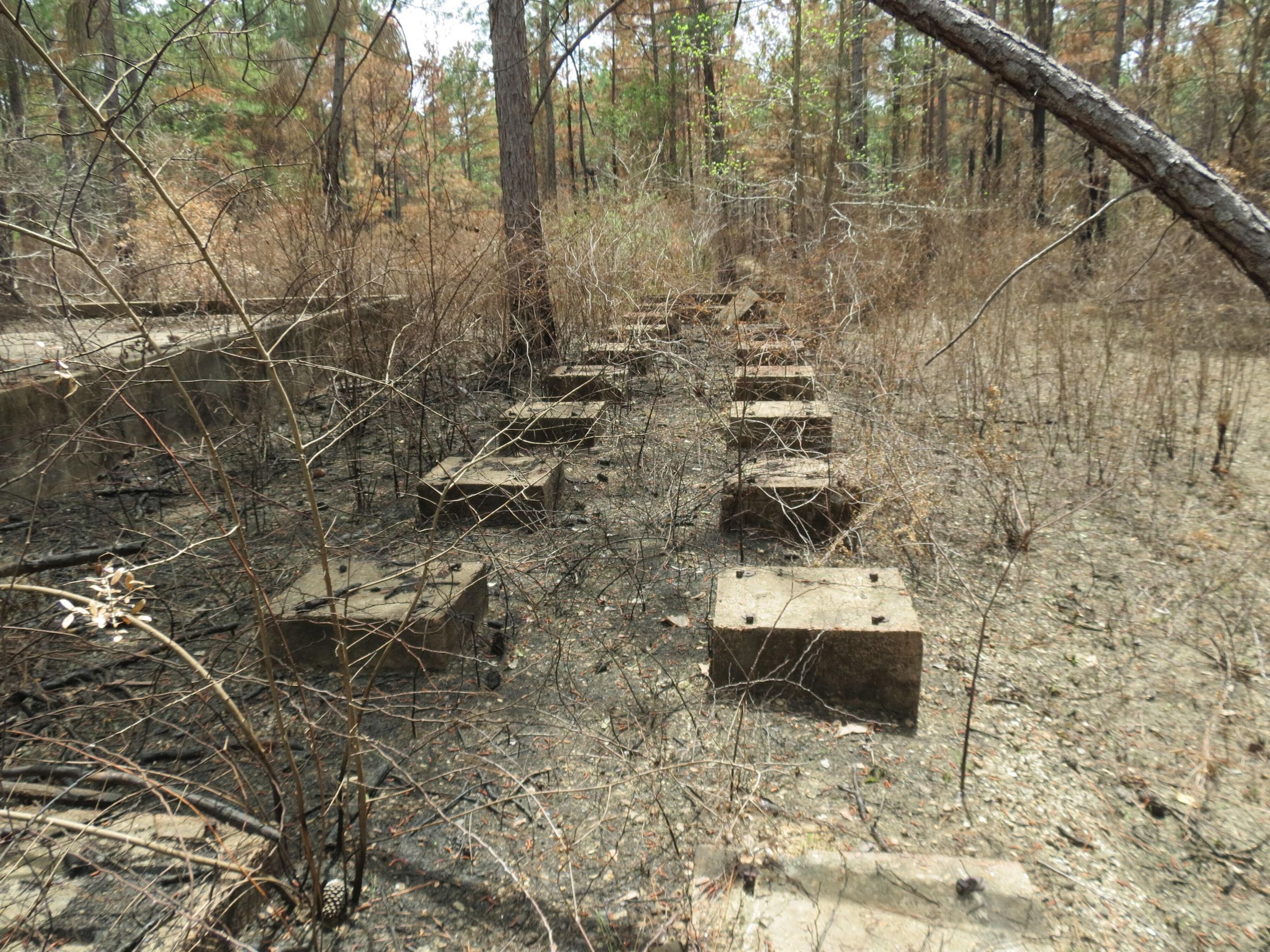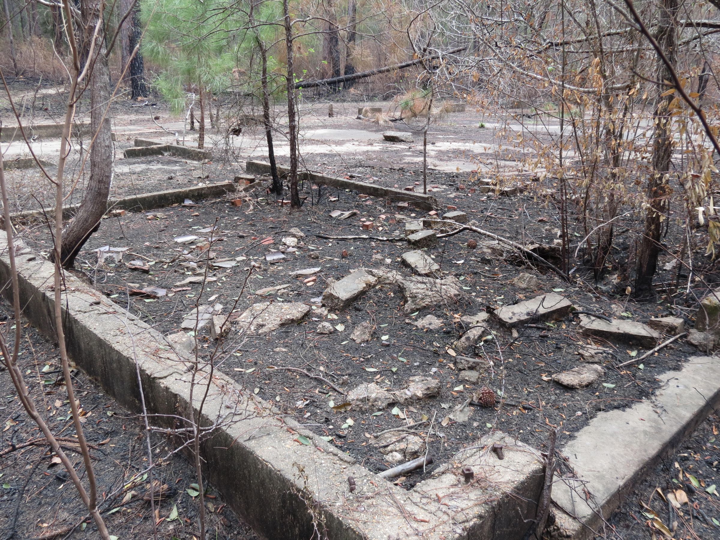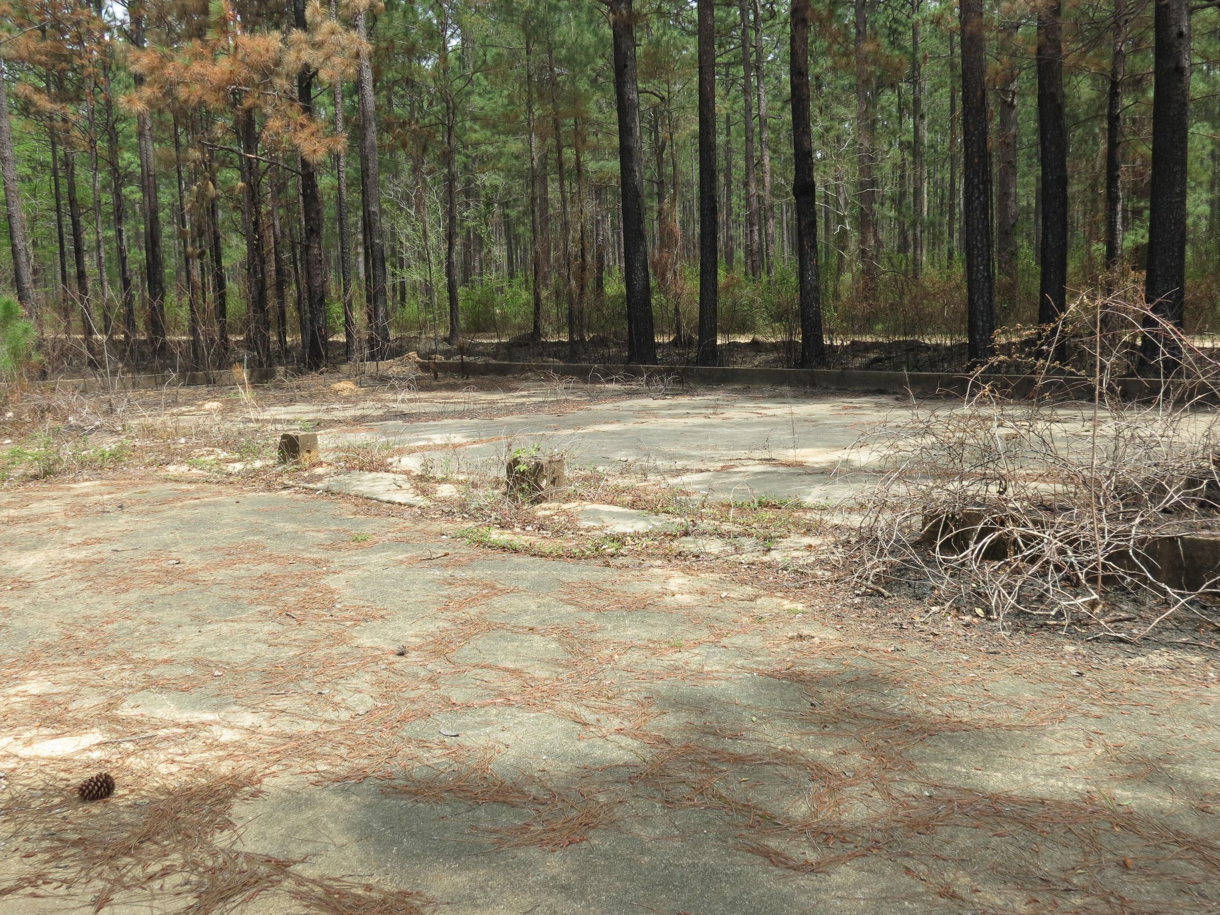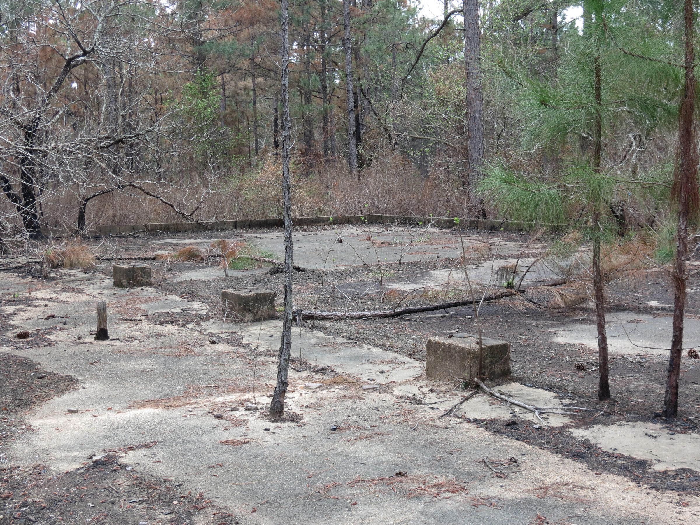 the ruins of the motor pool for the Black troop of Camp Claiborne; an example of what a motor pool looks like; the foundation of the dispatch office building of the motor pool; the fuel point (by dispatch office); the offices and supply rooms ruins of the repair shop at the motor pool; the storage building for the motor pool; the garage for the vehicles at the motor pool; the garage has protective barriers around it and supports; the garage offices; vehicle repair building for the motor pool; services pits and racks beside the repair shop and garage/maintenance; wooden posts to keep vehicles from hitting the buildings; utilities of the buildings (wires, furnaces); wash rack and drainage systemPhotograph Details