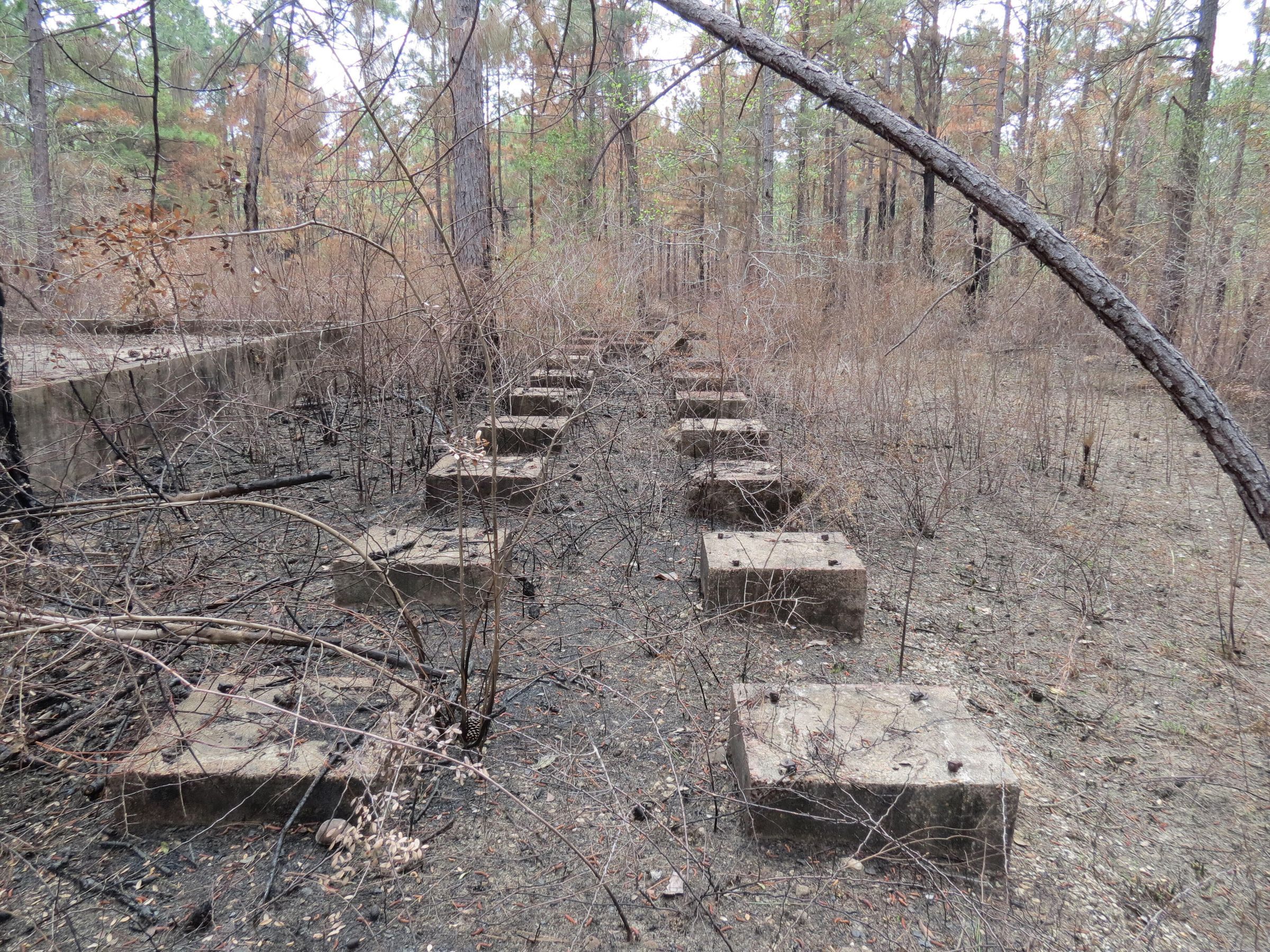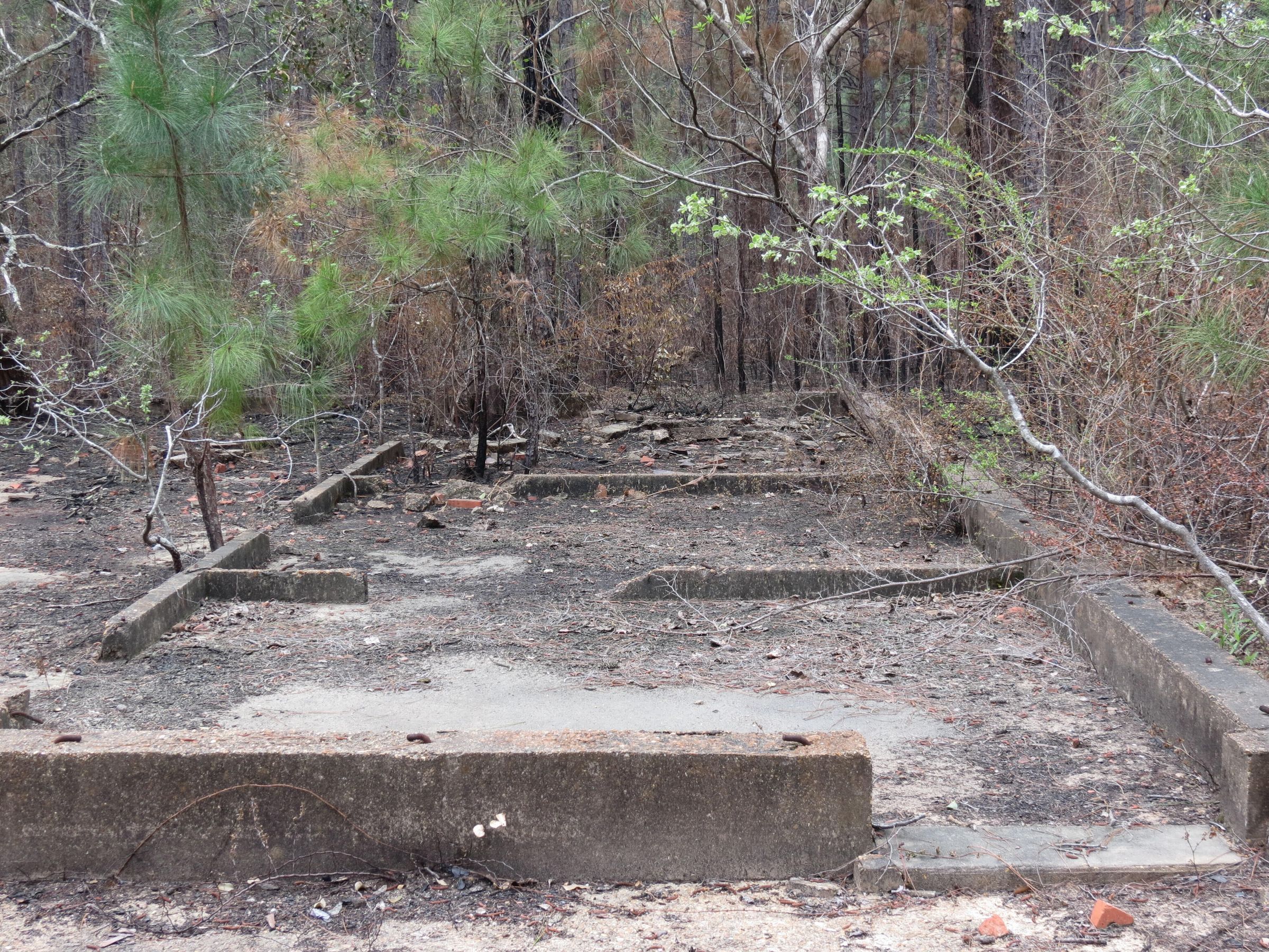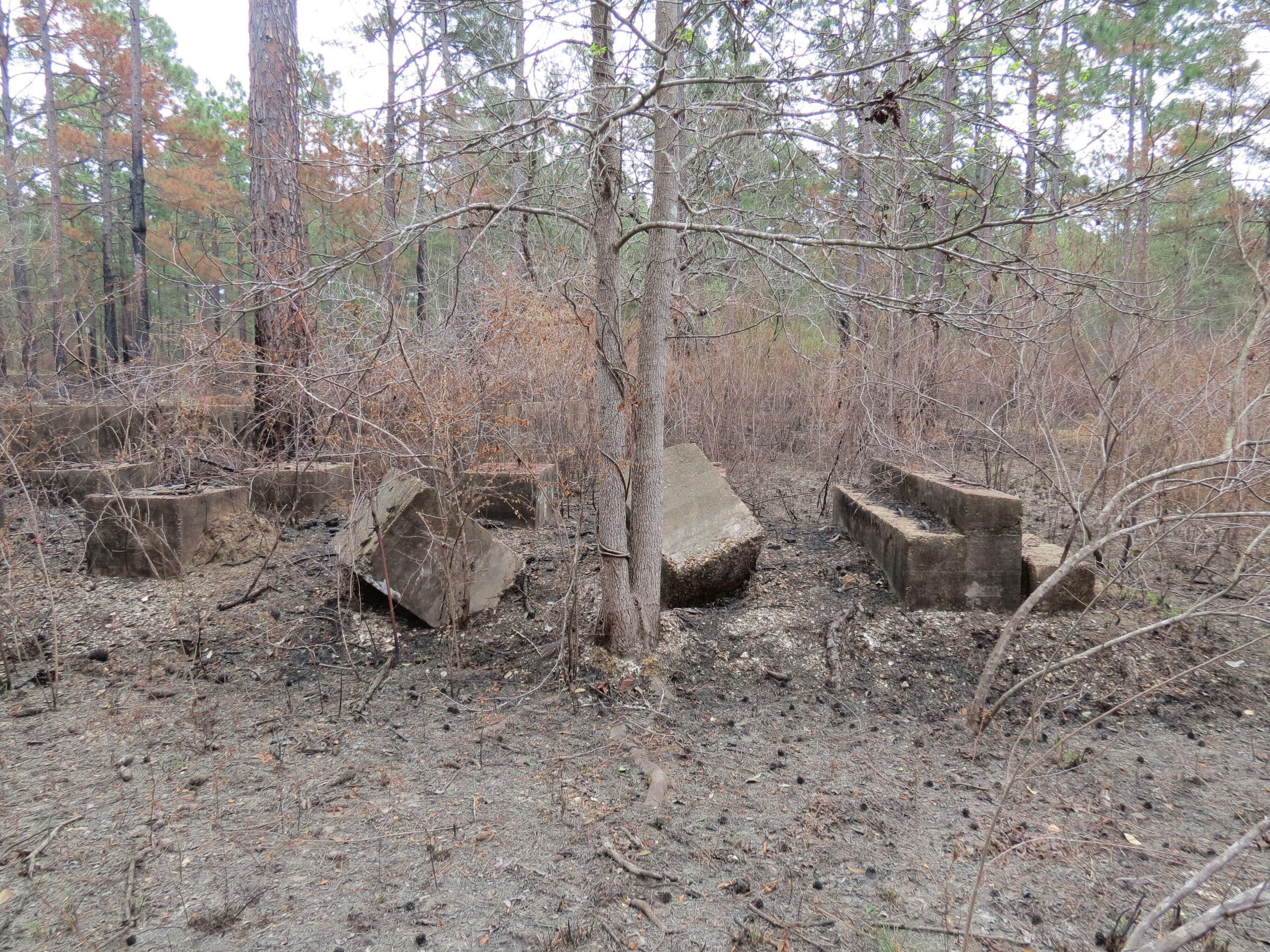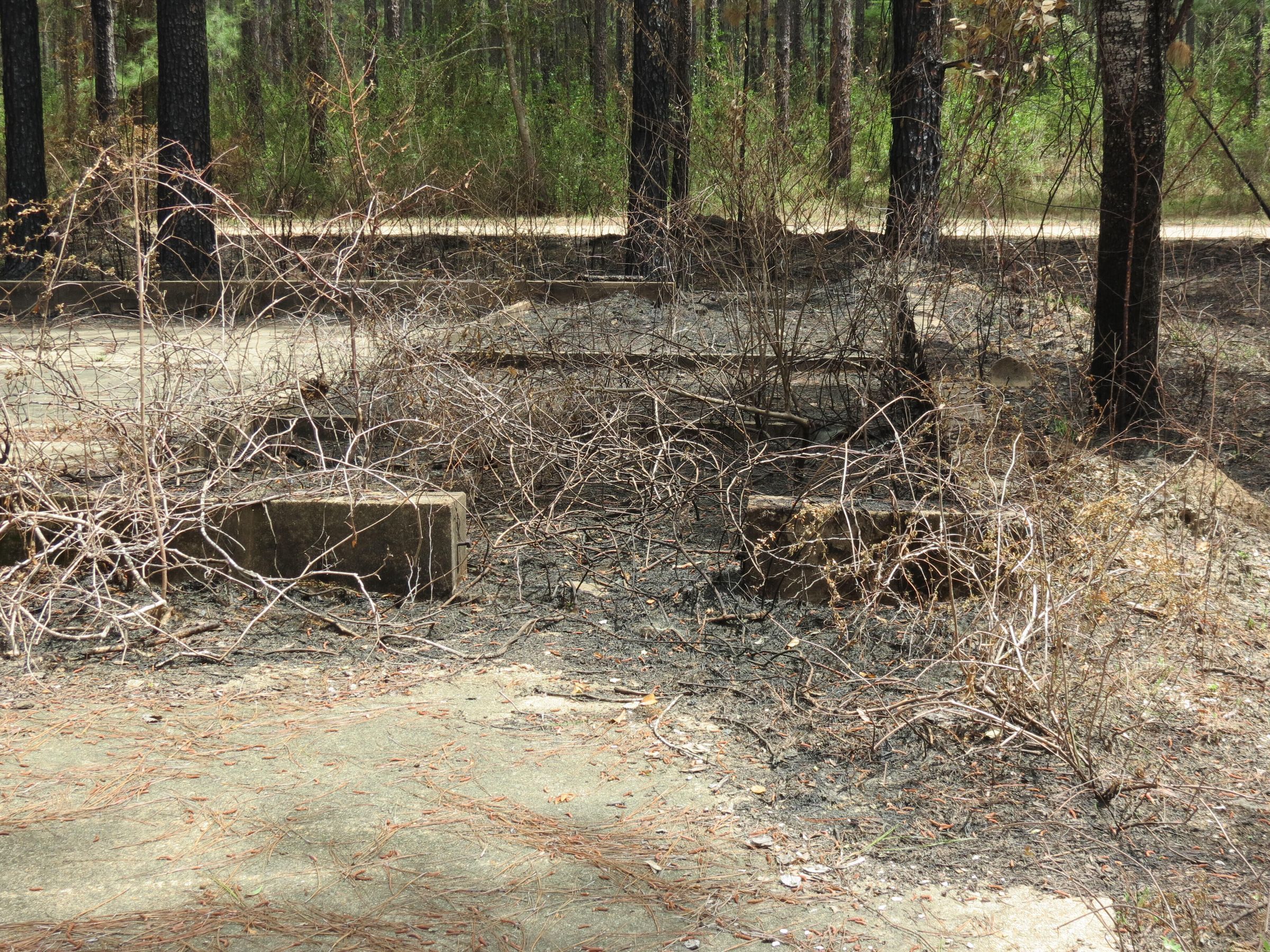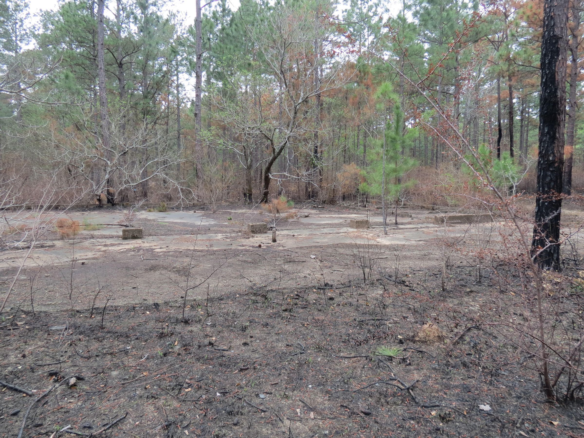 the ruins of the motor pool for the Black troop of Camp Claiborne; an example of what a motor pool looks like; the foundation of the dispatch office building of the motor pool; the fuel point (by dispatch office); the offices and supply rooms ruins of the repair shop at the motor pool; the storage building for the motor pool; the garage for the vehicles at the motor pool; the garage has protective barriers around it and supports; the garage offices; vehicle repair building for the motor pool; services pits and racks beside the repair shop and garage/maintenance; wooden posts to keep vehicles from hitting the buildings; utilities of the buildings (wires, furnaces); wash rack and drainage systemPhotograph Details