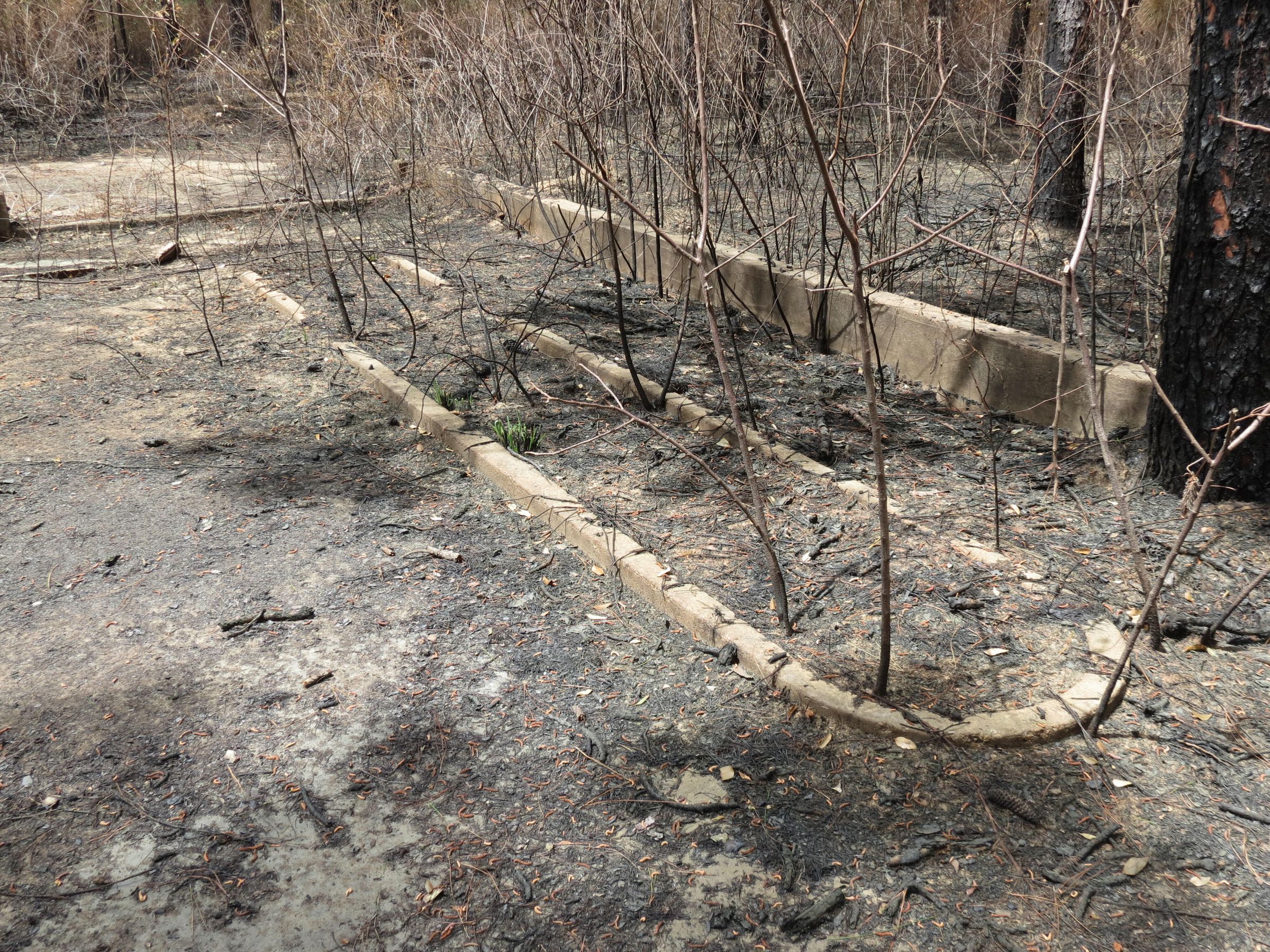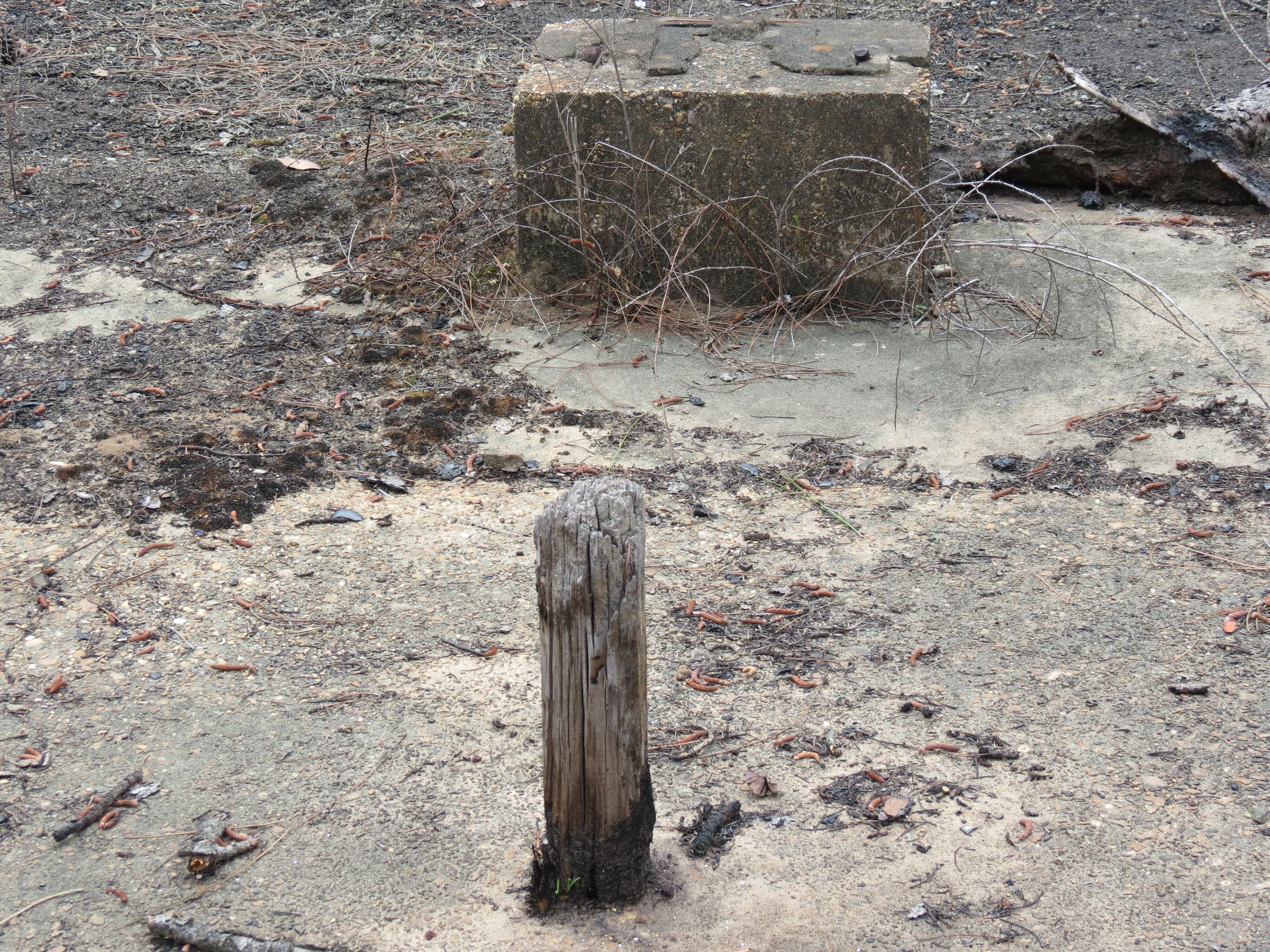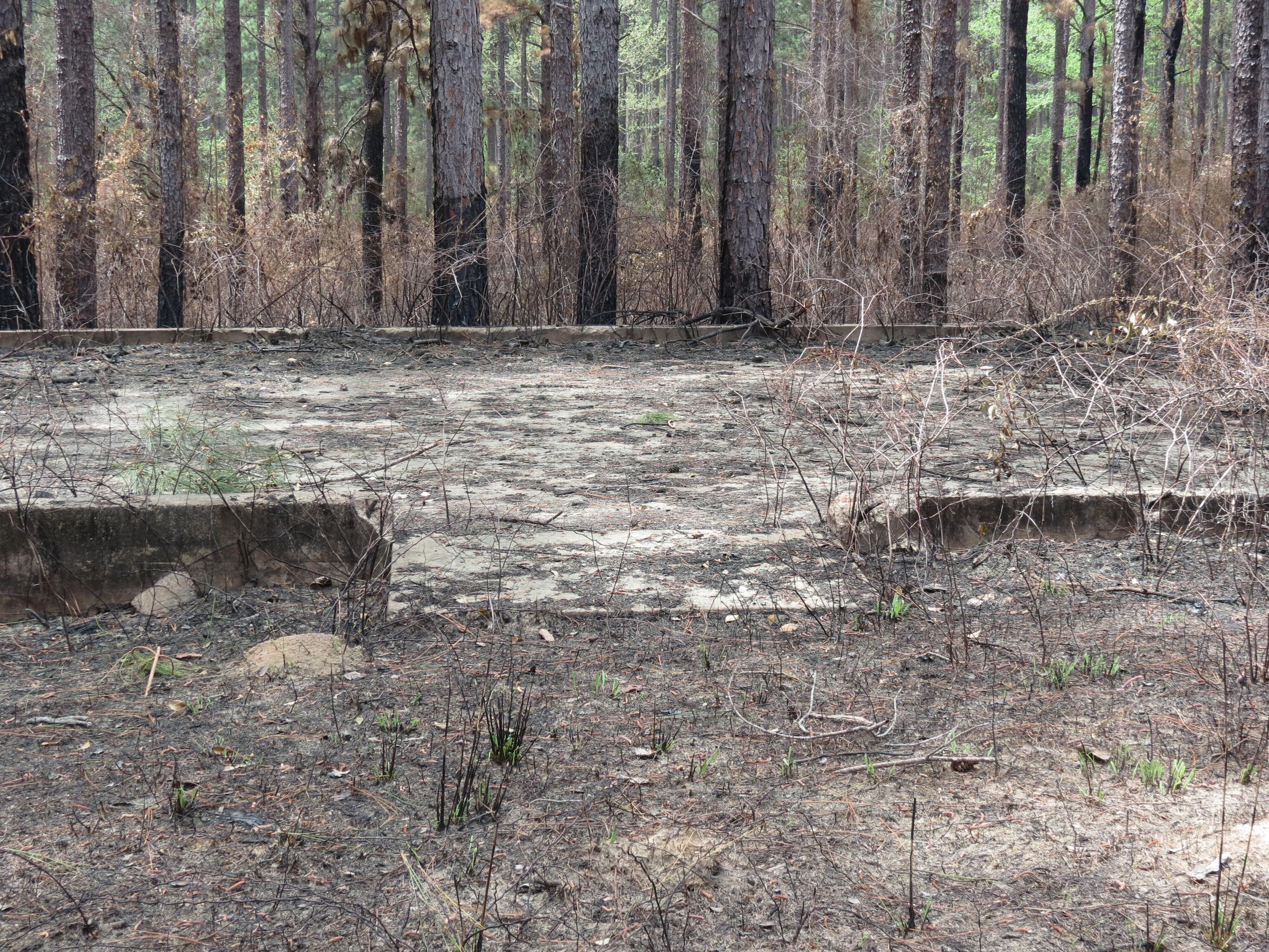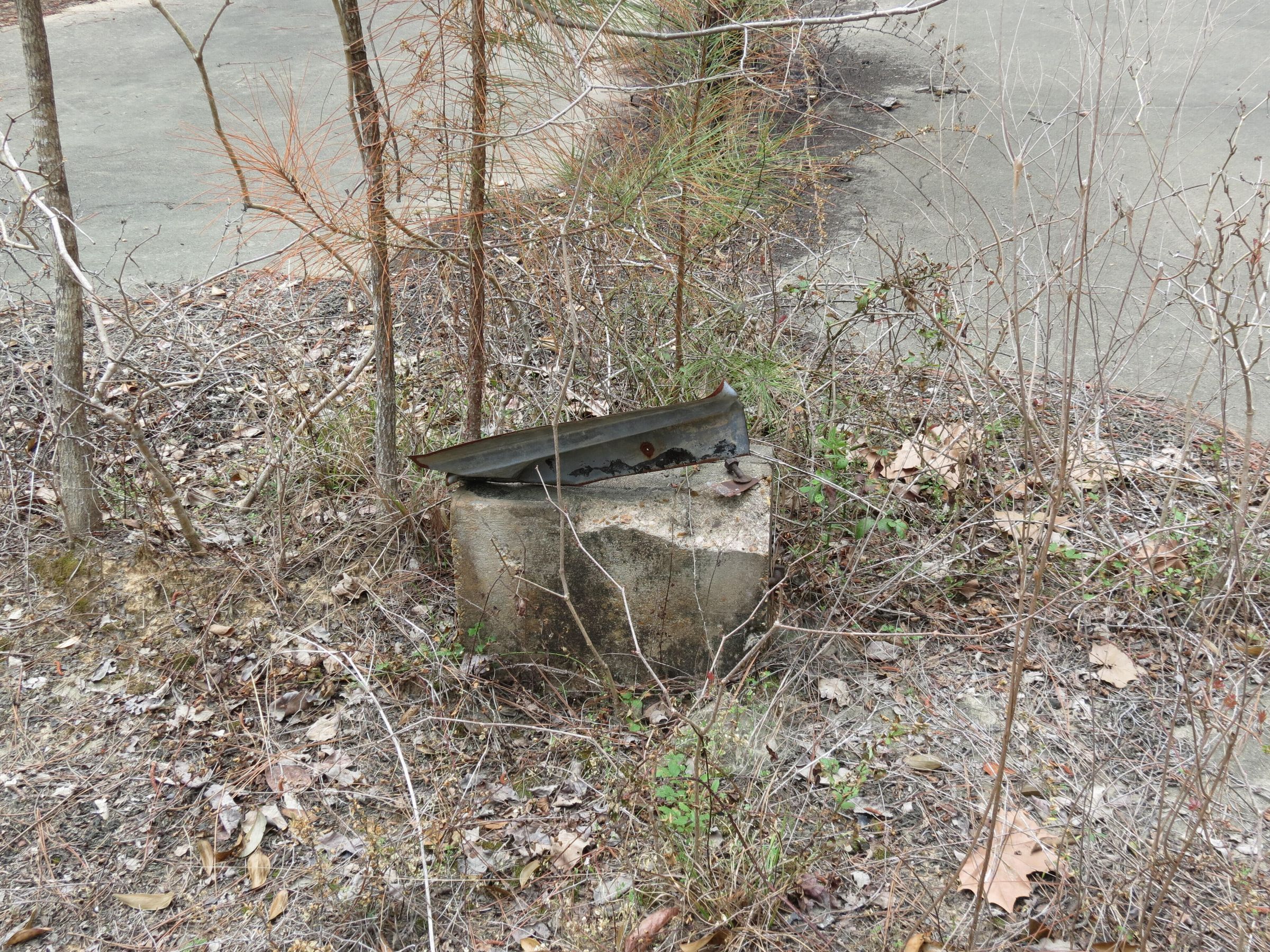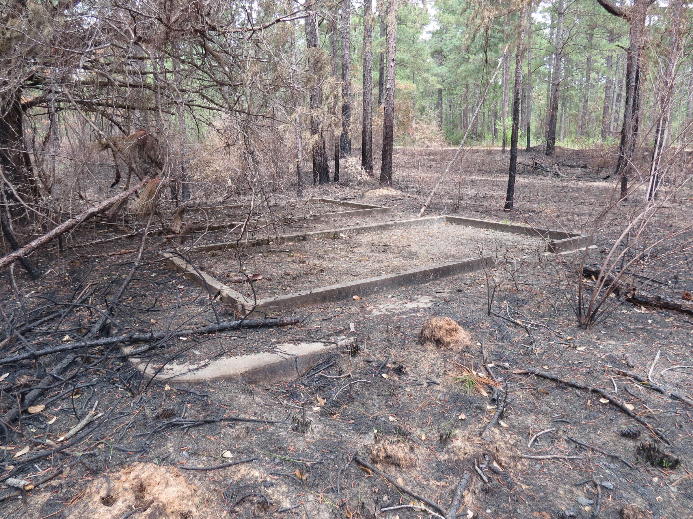 the ruins of the motor pool for the Black troop of Camp Claiborne; an example of what a motor pool looks like; the foundation of the dispatch office building of the motor pool; the fuel point (by dispatch office); the offices and supply rooms ruins of the repair shop at the motor pool; the storage building for the motor pool; the garage for the vehicles at the motor pool; the garage has protective barriers around it and supports; the garage offices; vehicle repair building for the motor pool; services pits and racks beside the repair shop and garage/maintenance; wooden posts to keep vehicles from hitting the buildings; utilities of the buildings (wires, furnaces); wash rack and drainage systemPhotograph Details