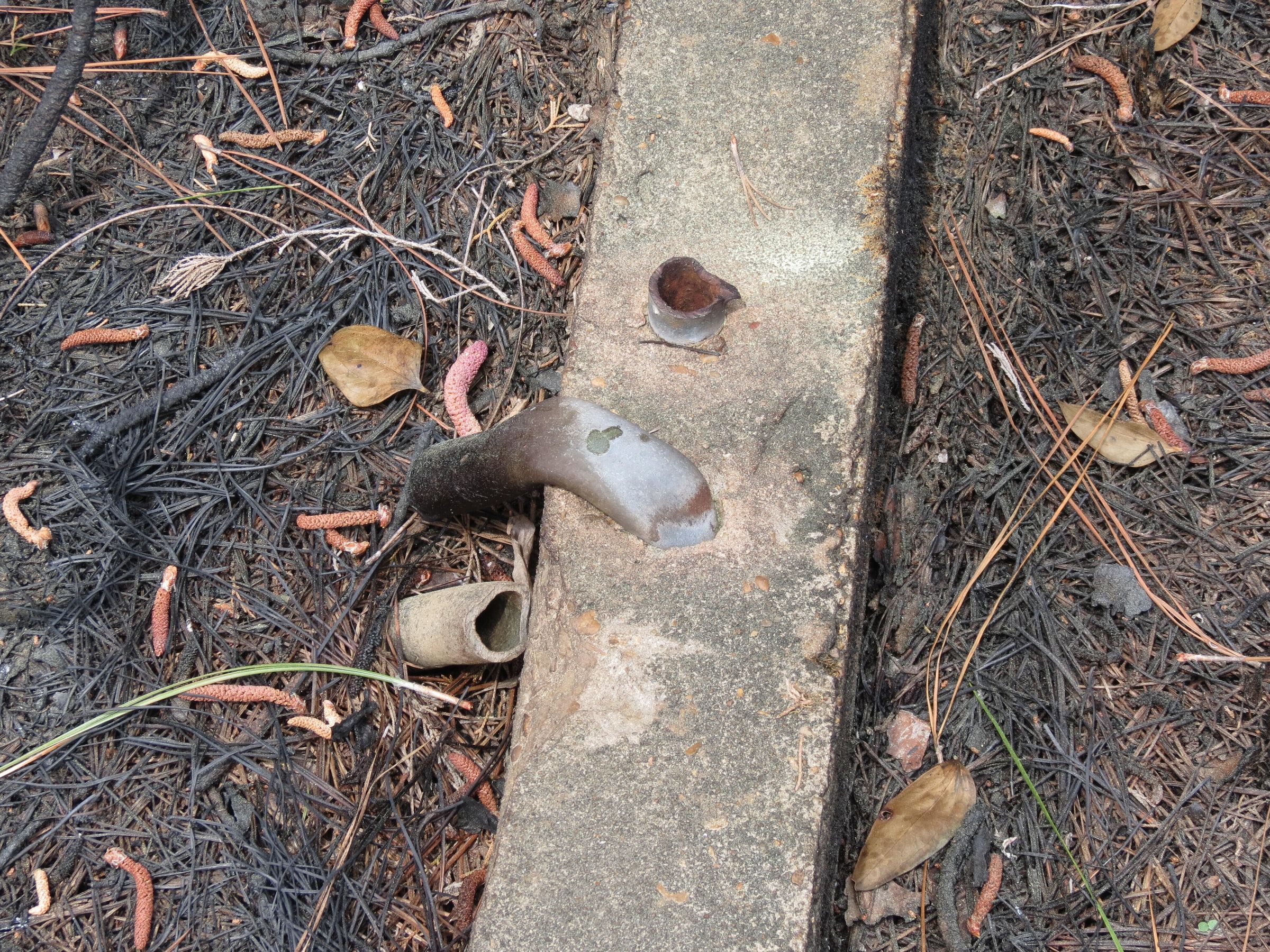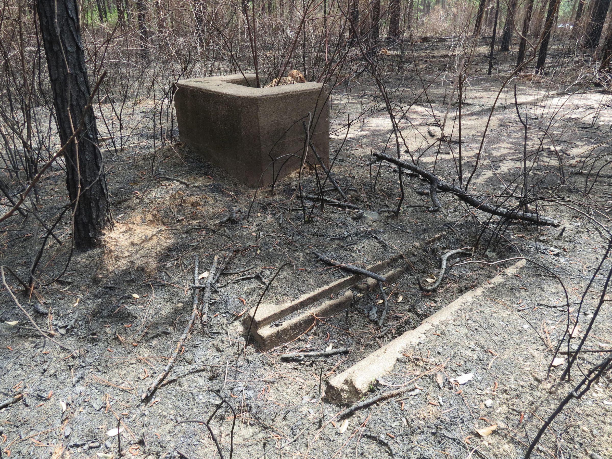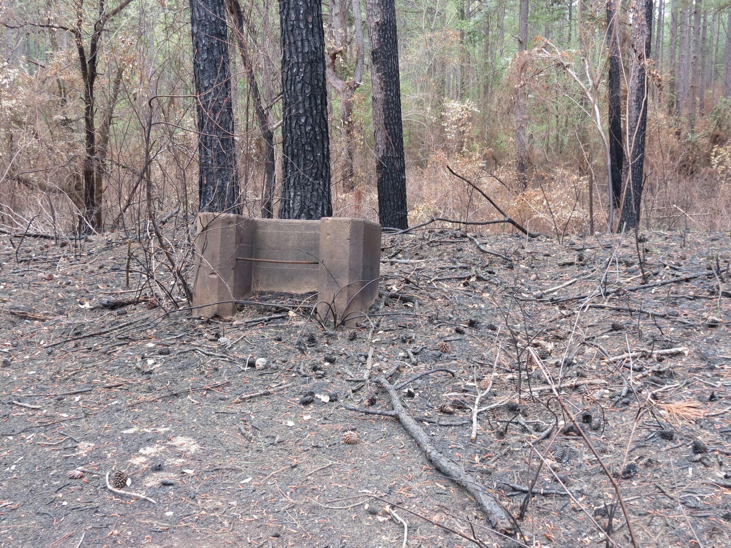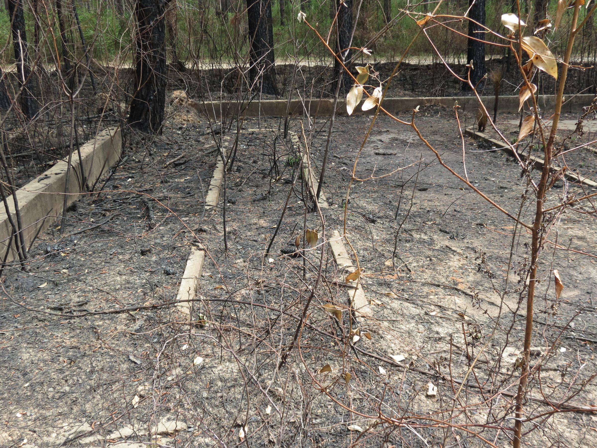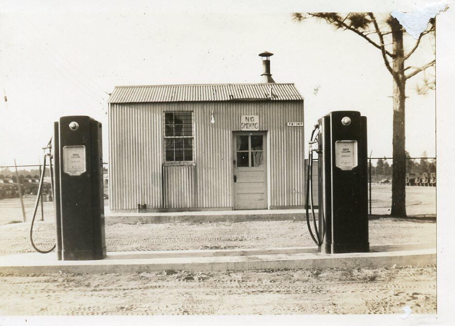 the ruins of the motor pool for the Black troop of Camp Claiborne; an example of what a motor pool looks like; the foundation of the dispatch office building of the motor pool; the fuel point (by dispatch office); the offices and supply rooms ruins of the repair shop at the motor pool; the storage building for the motor pool; the garage for the vehicles at the motor pool; the garage has protective barriers around it and supports; the garage offices; vehicle repair building for the motor pool; services pits and racks beside the repair shop and garage/maintenance; wooden posts to keep vehicles from hitting the buildings; utilities of the buildings (wires, furnaces); wash rack and drainage systemPhotograph Details