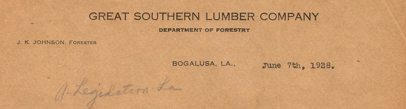 Great Southern Lumber Company began operations during the late 1920s as the Great Depression was about to begin. J.K. Johnson was a local forester known in the company. The company was forced to shut down to the lumber in Bogalusa drying up.Collection