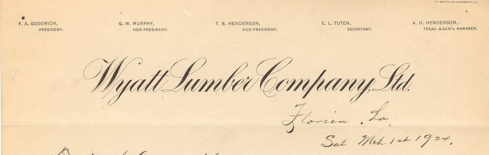 Wyatt Lumber Company began operations in Floria, Louisiana. The lumber mill was forced to close down due to local resources drying up via trees and turpentine.Collection