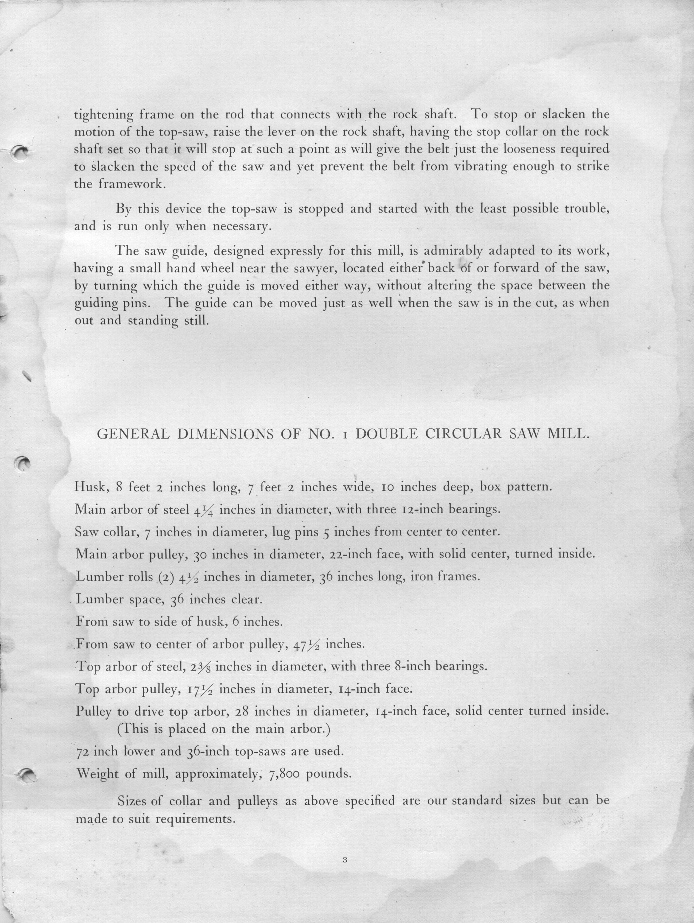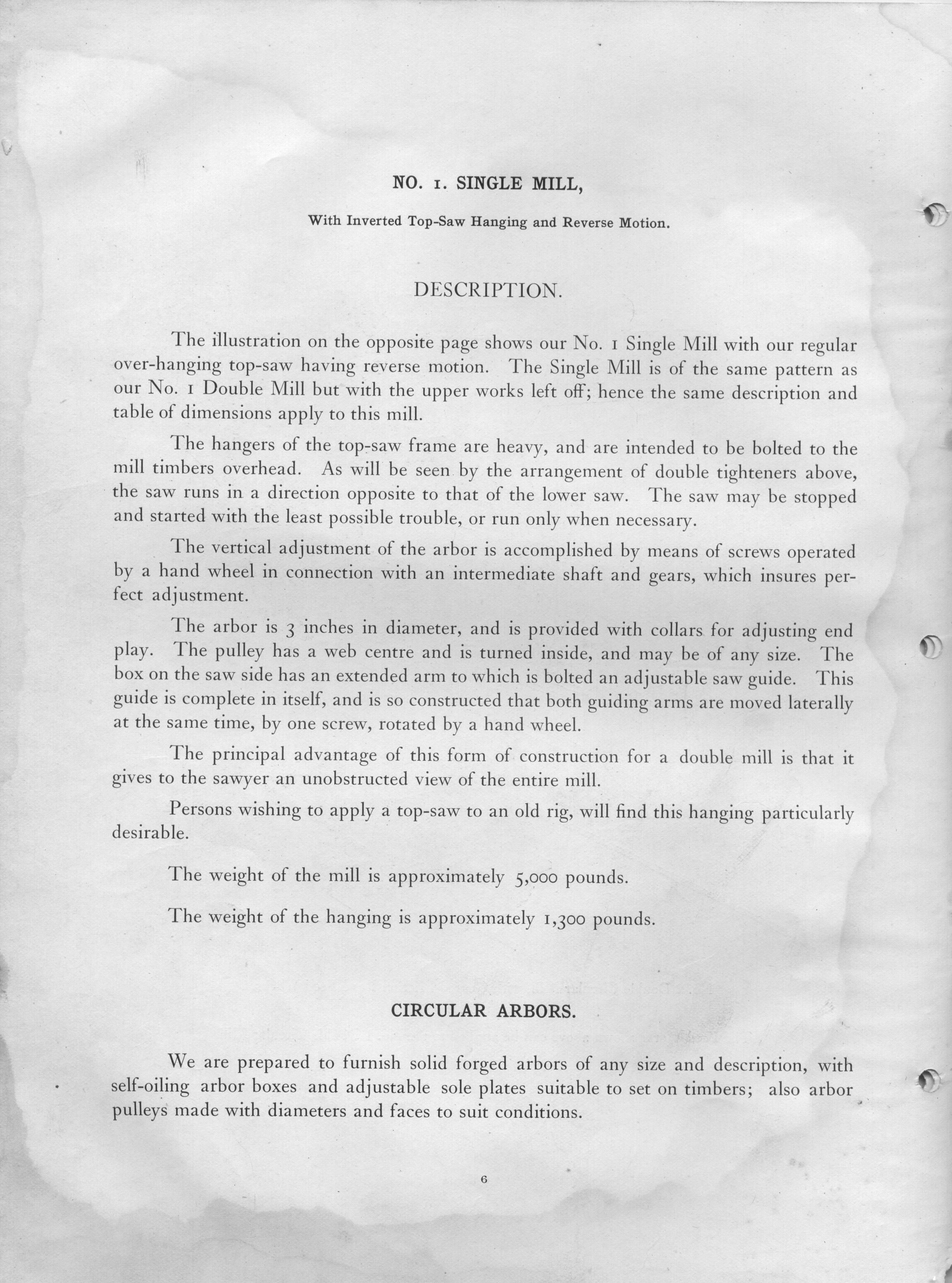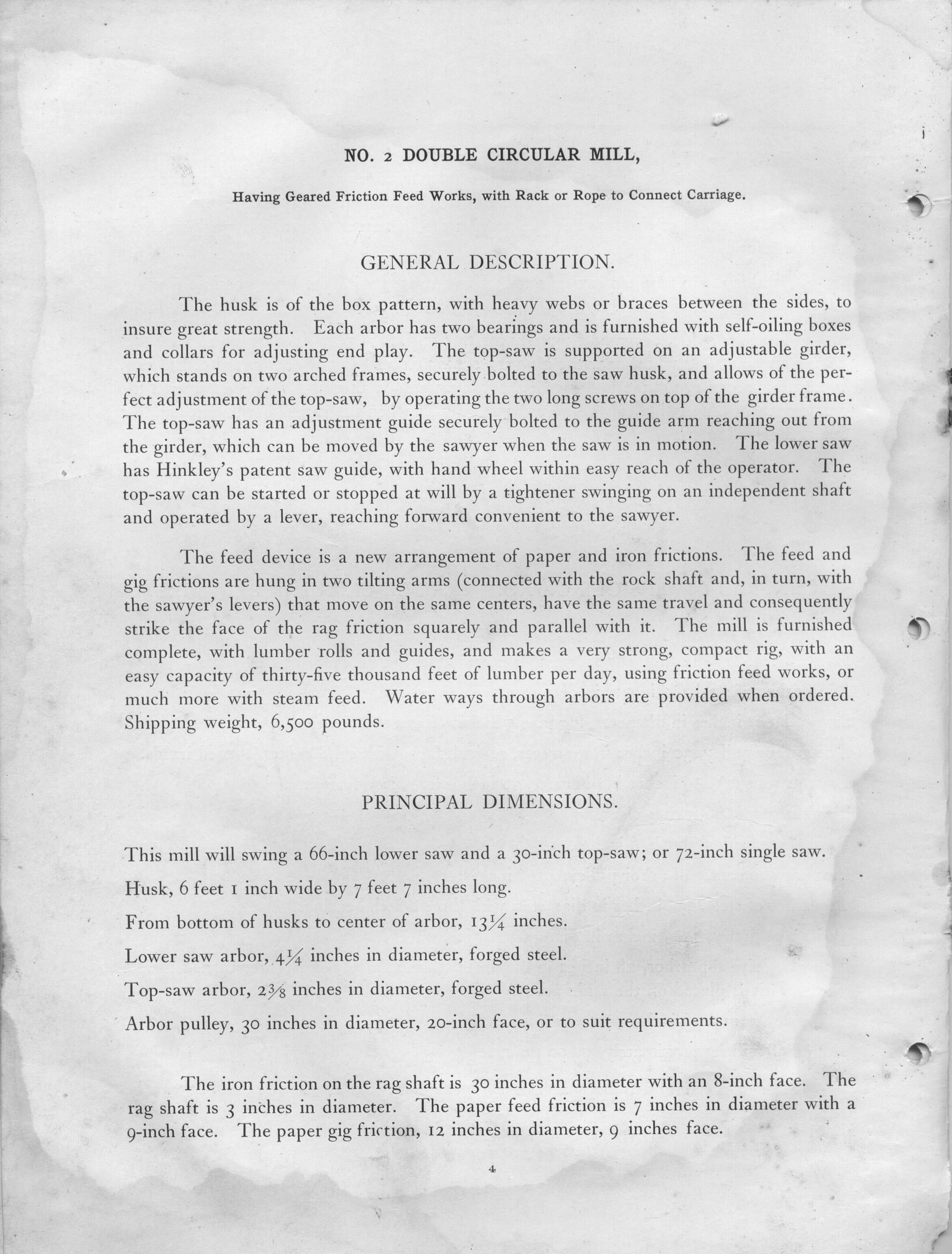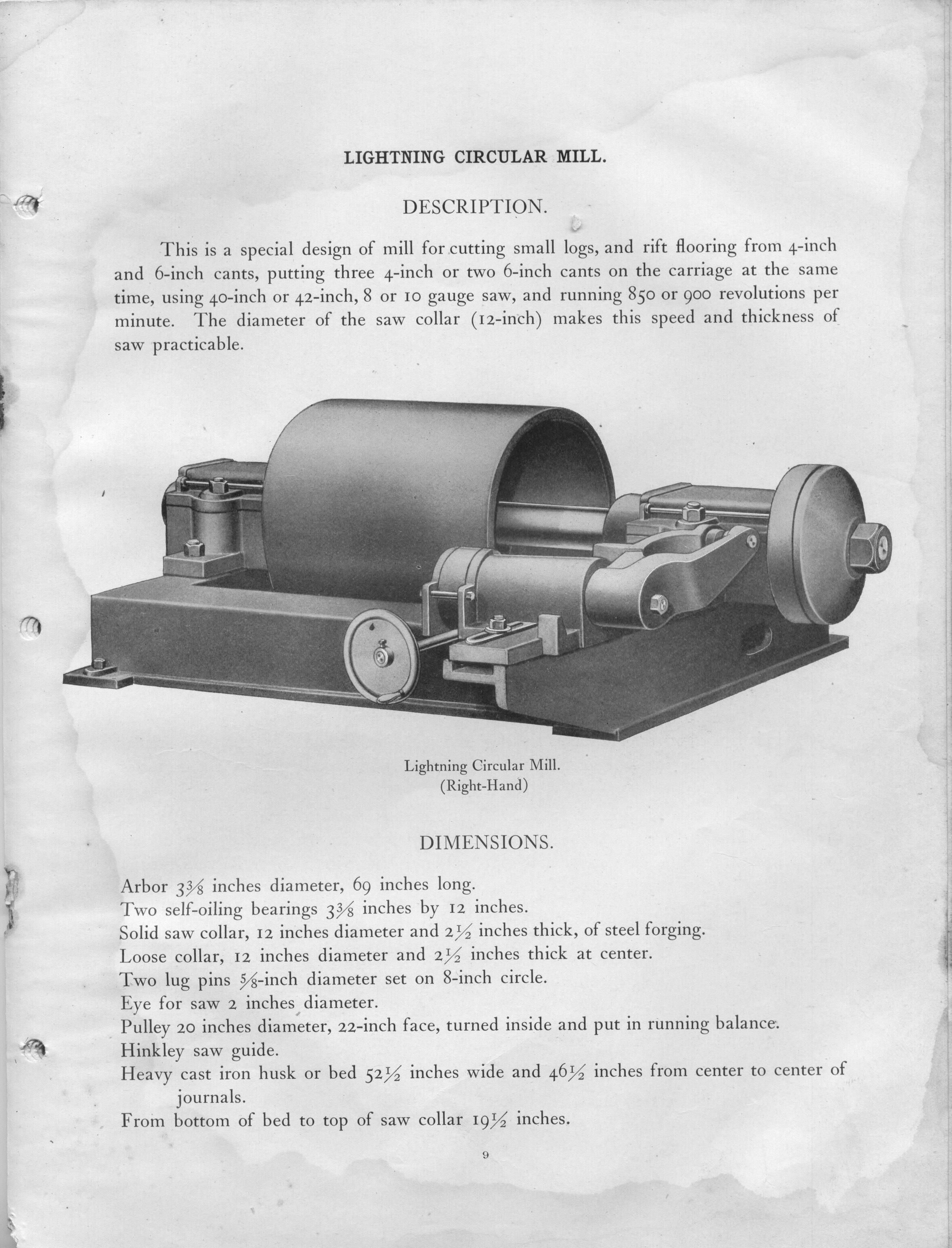 Out of New Orleans District company; gives the descriptions and dimensions of each item; features: No. 1 double circular mill, No. 2 double circular mill, no. 2 with geared friction rope feed, No. 1 single mill, No. 2 single circular mill, Lightning circular mill, Hinkley saw guide, parts: outside and inside arms, bed to cylinder, worm nut, cap over worm nut, worm to operate nut with square hole, worm to operate nut with round hole, hand wheel for rode to operate worm, box to support rod, lignum vitae guide, collar bolt that connects to guide arms, cap bolt the connects cap to cylinder or bed and rod for hand wheel to operate worm, Heavy inverted top saw hanger, and "Hand" of sawsContext