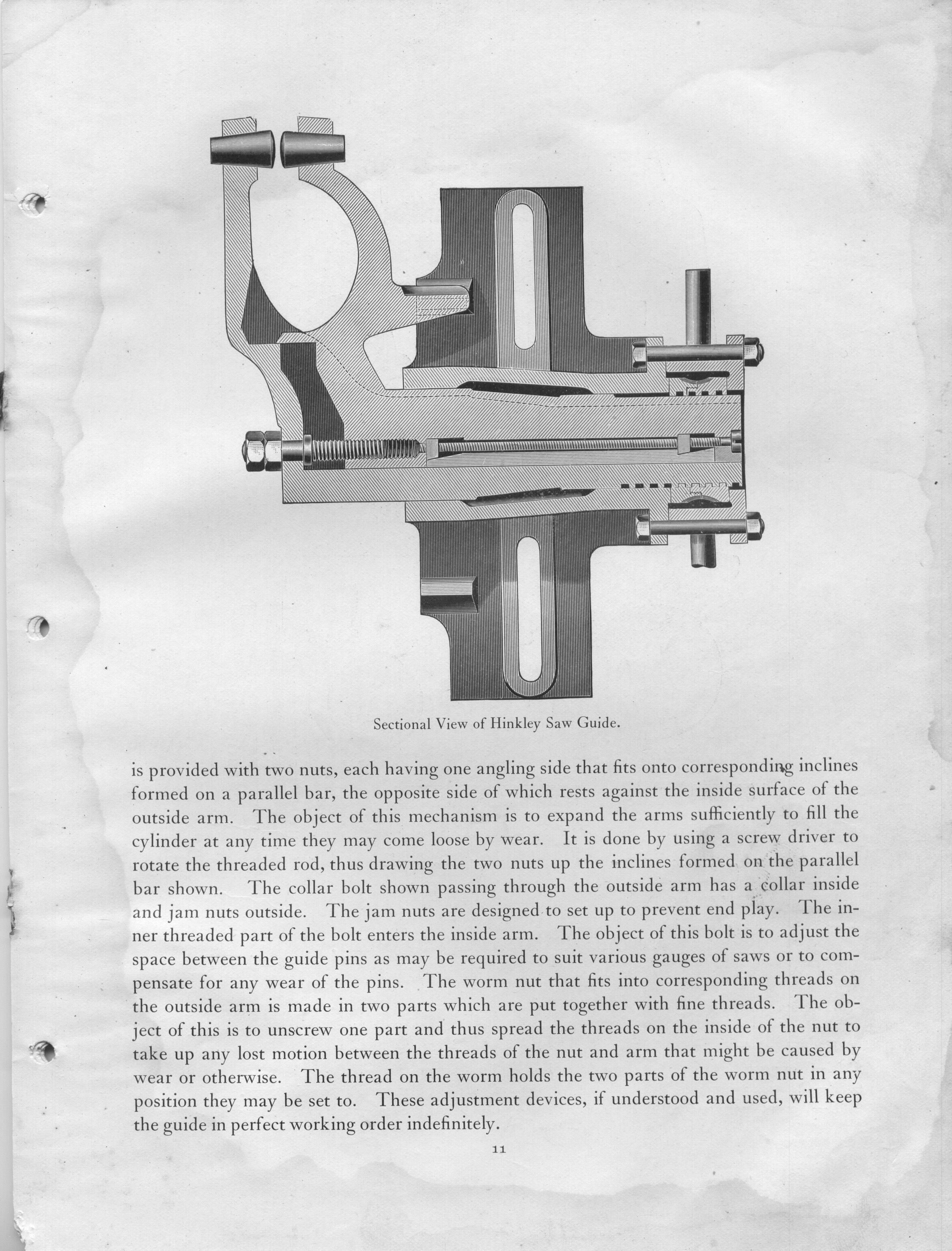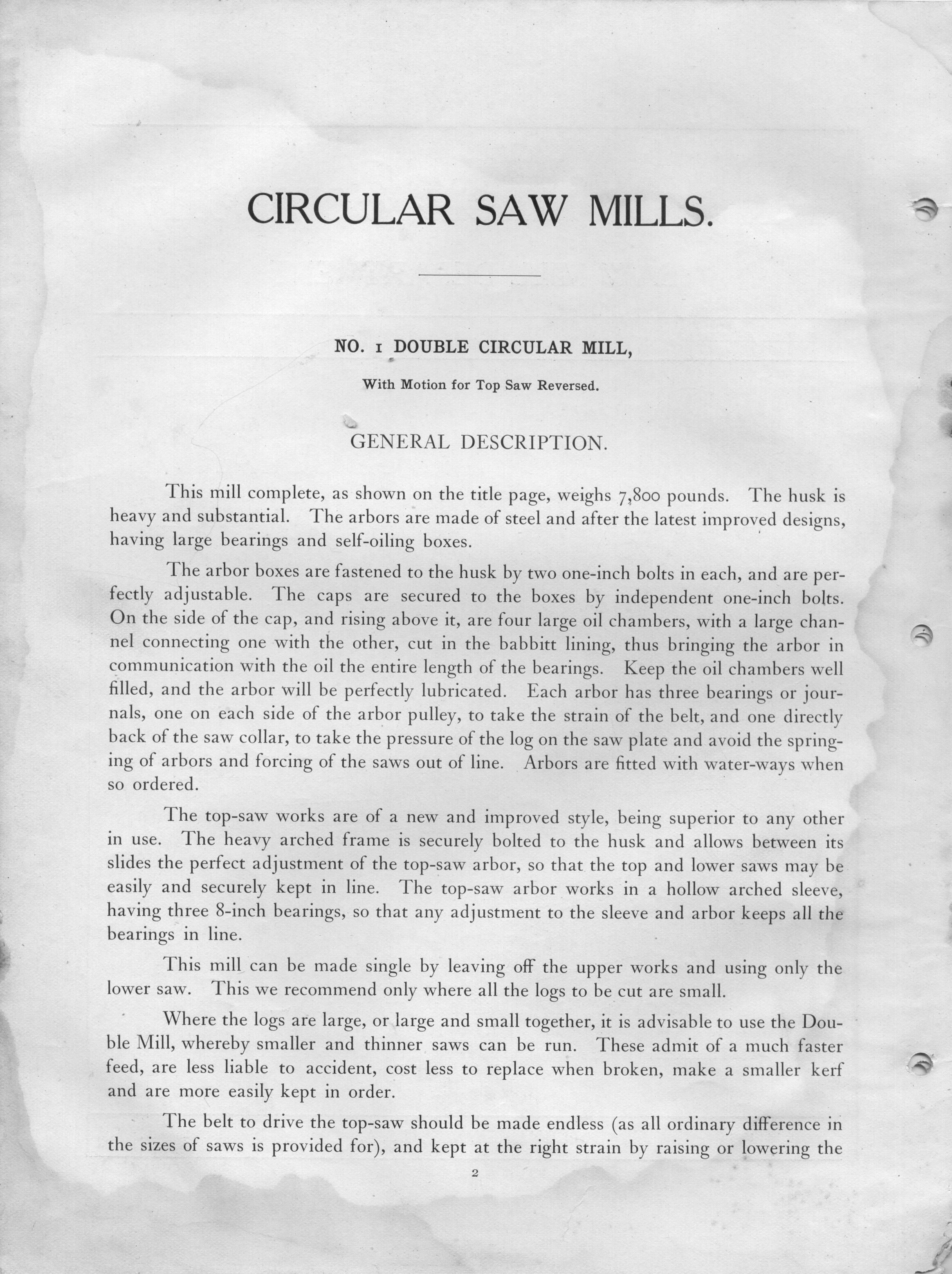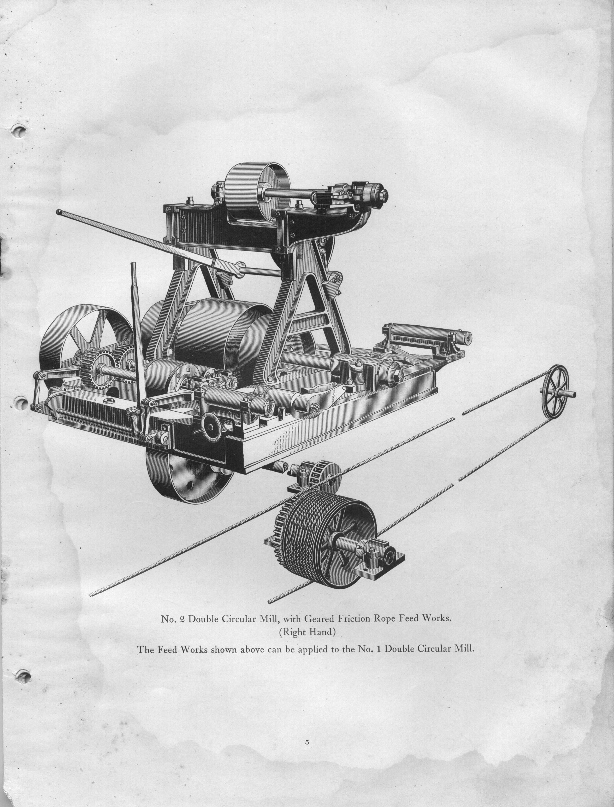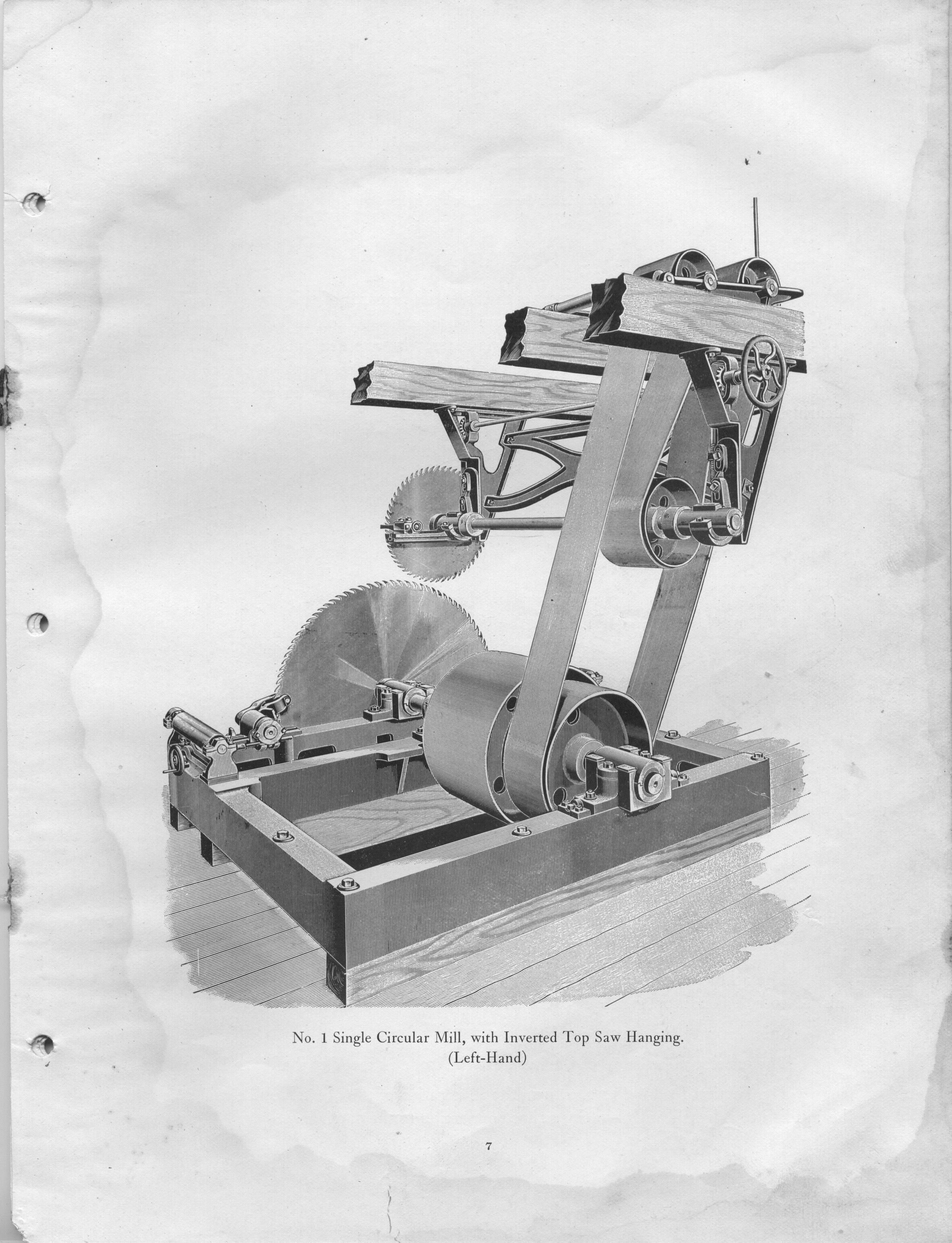 Out of New Orleans District company; gives the descriptions and dimensions of each item; features: No. 1 double circular mill, No. 2 double circular mill, no. 2 with geared friction rope feed, No. 1 single mill, No. 2 single circular mill, Lightning circular mill, Hinkley saw guide, parts: outside and inside arms, bed to cylinder, worm nut, cap over worm nut, worm to operate nut with square hole, worm to operate nut with round hole, hand wheel for rode to operate worm, box to support rod, lignum vitae guide, collar bolt that connects to guide arms, cap bolt the connects cap to cylinder or bed and rod for hand wheel to operate worm, Heavy inverted top saw hanger, and "Hand" of sawsContext
