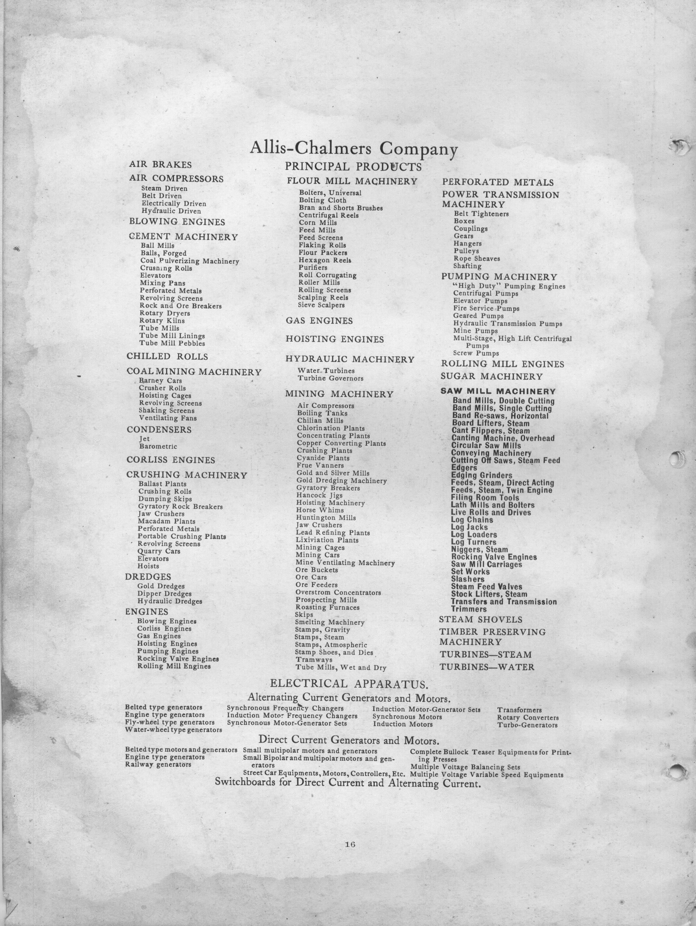 has equipment of air brakes, air compressors, blowing engines, cement machinery, chilled rolls, coal mining machinery, condensers, Corliss engines, crushing machinery, dredges, engines, electrical apparatus (alternating current, direct current, and switchboards for generators and motors), flour mill machinery, gas engines, hoisting engines, hydraulic machinery, mining machinery, perforated metals, power transmission machinery, pumping machinery, rolling mill engines, sugar machinery, sawmill machinery, steam shovels, timber preserving machinery, turbines-steam, and turbines-water