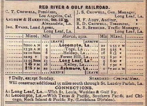 the officials in 1910 were C. T. Crowell president in Los Angles, Andrew & Hakenyos general attorneys in Alexandria, John Evans land agent in Long Leaf, J. S. Crowell general manager in Long Leaf, H. F. Adev auditor in Long Leaf, R. D. Crowell treasurer in Long Leaf, and A. B. Spencer traffic manager in Long Leaf;