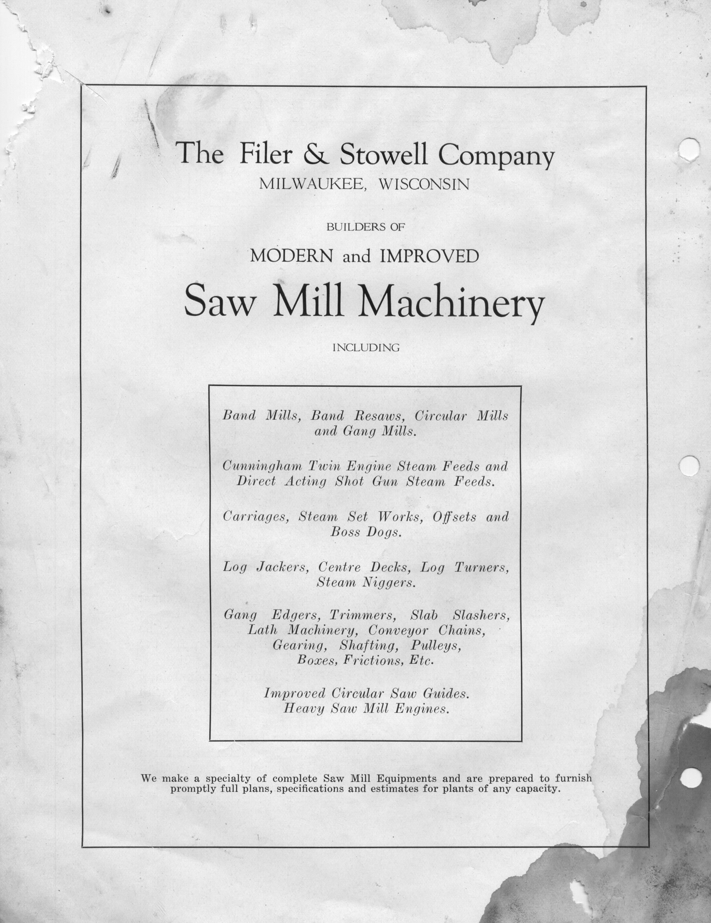 builders of saw mill machinery: Band mills, Band resaws, Circular mills, Gang mills, Cunningham twin engine steam feeds, Direct acting shot gun steam feeds, carriages, Steam set works, Offsets, Boss dogs, Log jackers, Centre decks, Log turners, Steam niggers, Gang edgers, trimmers, Slab slashers, Lath machinery, Conveyor chains, Gearing, Shafting, Pulleys, Boxes, Frictions, Circular saw guides, and Heavy saw mill engines