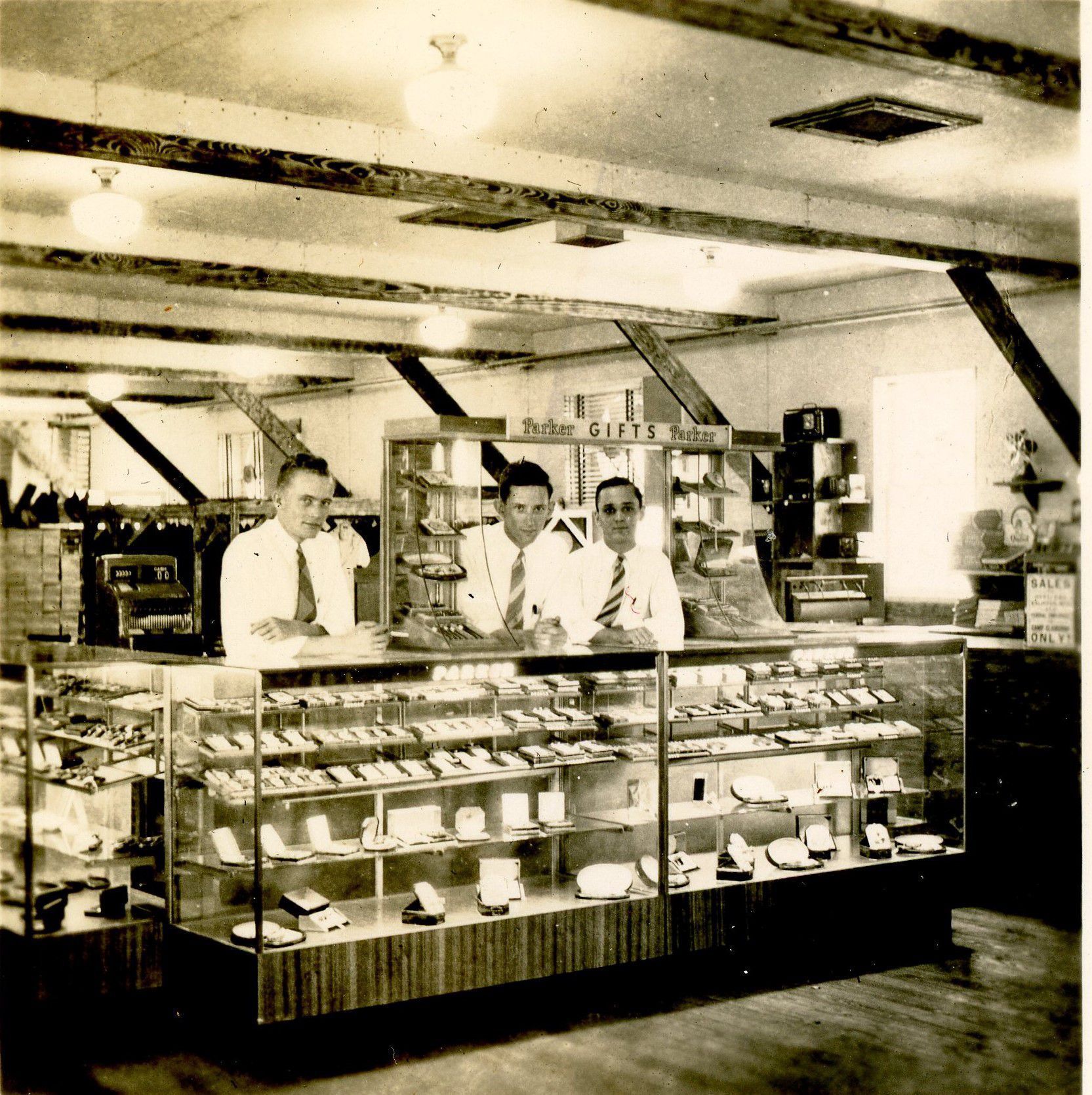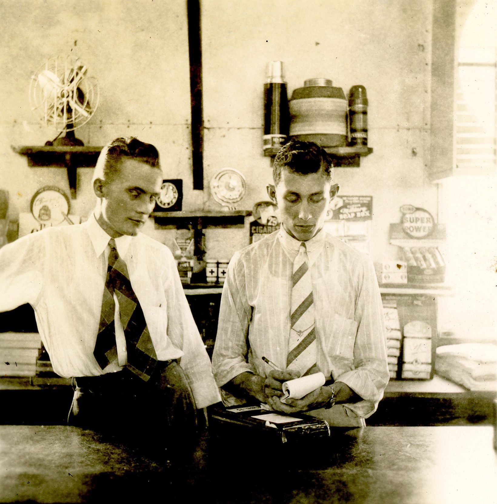The returning collegians were Henry Sterk, (lawer) Billy Vice, (engineer) George Roussel, (graduate physicist). After their return they are depicted providing service behind a department store counter and inspecting the weekly sale.Collection
