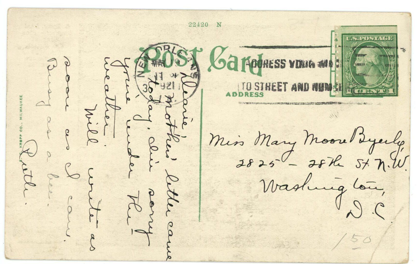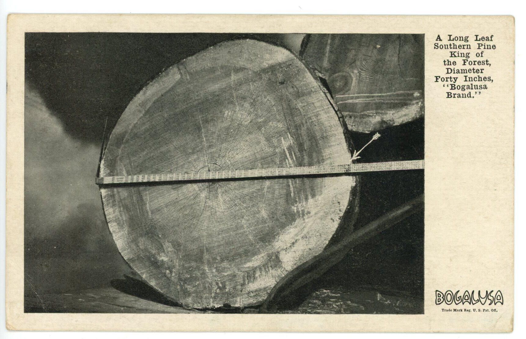 black and white snapshot of a long leaf southern pine, King of the Forest, diameter forty inches, "Bogalusa Brand;" sent by Ruth in New Orleans, LA to Miss Mary Moore Byerly in Washington D.C.; May 19 1921Collection