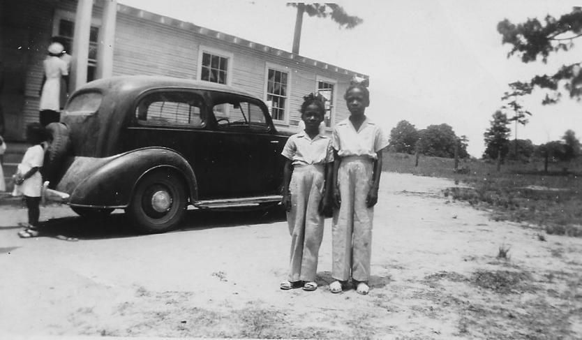 the negro elementary yard with children walking through it; 2 students are standing in front of a carPhotograph Details
