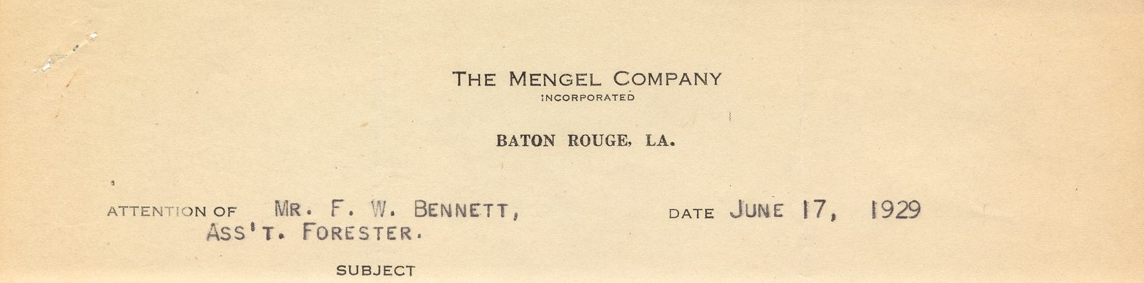 The Mengal Company began operations in Baton Rouge, Louisiana as a lumber company. F. W. Bennett was the assistant forester at the company when it was forced to close down due to the extreme amount of lumber drying up.Collection
