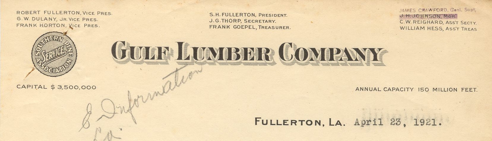 Gulf Lumber Company began operations in Fullerton, Louisiana. The company specialized in pine production. However, the company was forced to close down due to local resources drying up.Collection