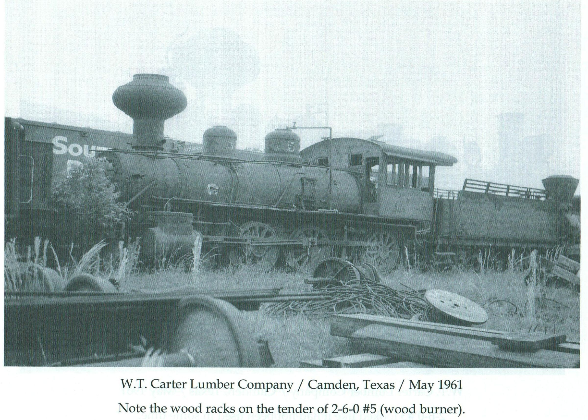 W. T. Carter Lumber Company / Camden, Texas / May 1961 Note the wood racks on the tender of 2-6-0 #5 (wood burner)Material/Technique