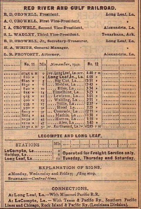 No. 11 leaves Long Leaf at 7:45 AM and makes stops at Long Leaf Junction (8:10--2 miles), Big Cut (8:20--5 miles), Melder (8:30--6 miles), Bliss (8:45--10 miles), Elmelhine (9:05--14 miles), Lewiston (9:25--21 miles), Walding (9:35-23 miles), Stille (10:00--27 miles), Hood (10:20--32 miles), Comrade (10:35--37 miles), Mathis (10:55--44 miles), Hutton (11:00--45 miles), Alco (11:15--47 miles) and arrives at Kurthwood at 11:30 (50 miles); No. 12 arrives at Long Leaf at 4:40 PM after making stops at Long Leaf Junction (4:05), Big Cut (3:51), Melder (3:43), Bliss (3:34), Elmelhine (3:23), Lewiston (3:01), Walding (2:51), Stille (2:37), Hood (2:25), Comrade (2:11), Mathis (1:58), Hutton (1:55), Alco (1:40) and left at Kurthwood at 12:45 PM; both trains run Monday, Wednesday and Friday;