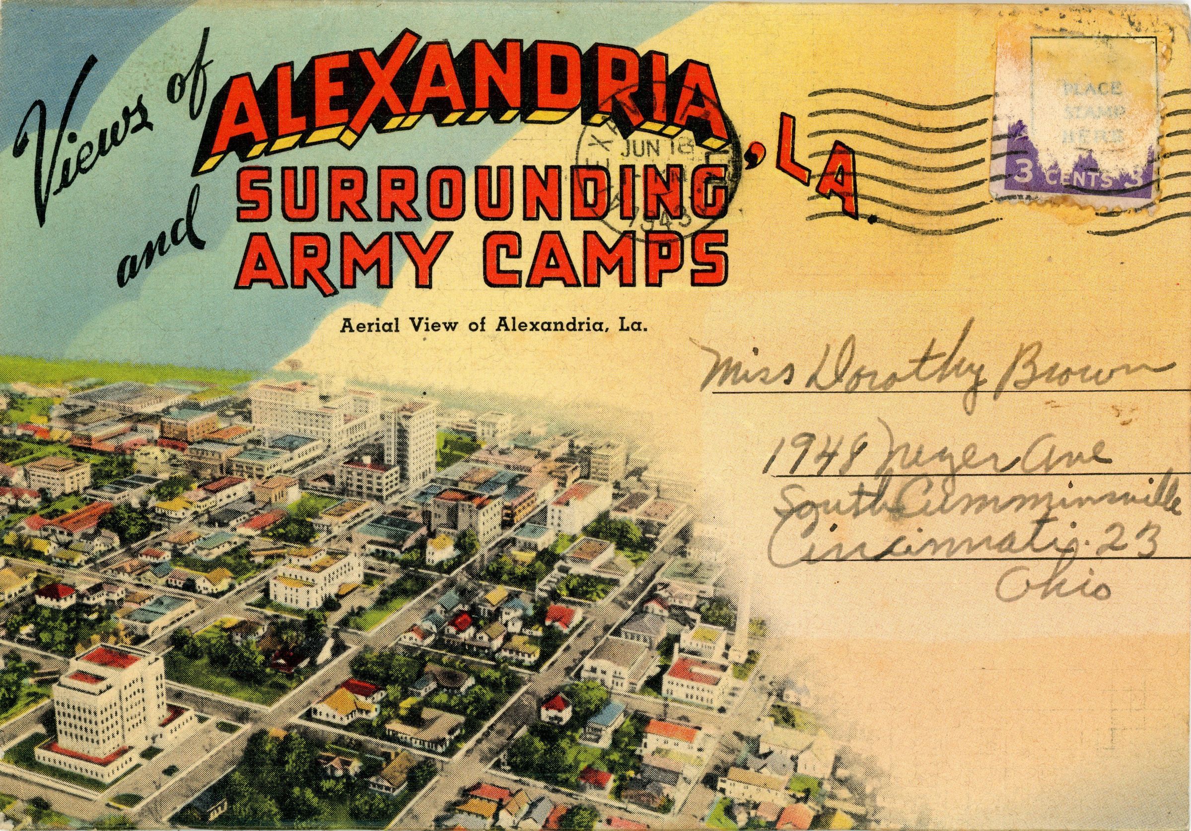 Post card received from Dorothy Brown expressed from local Louisiana army camp.Context