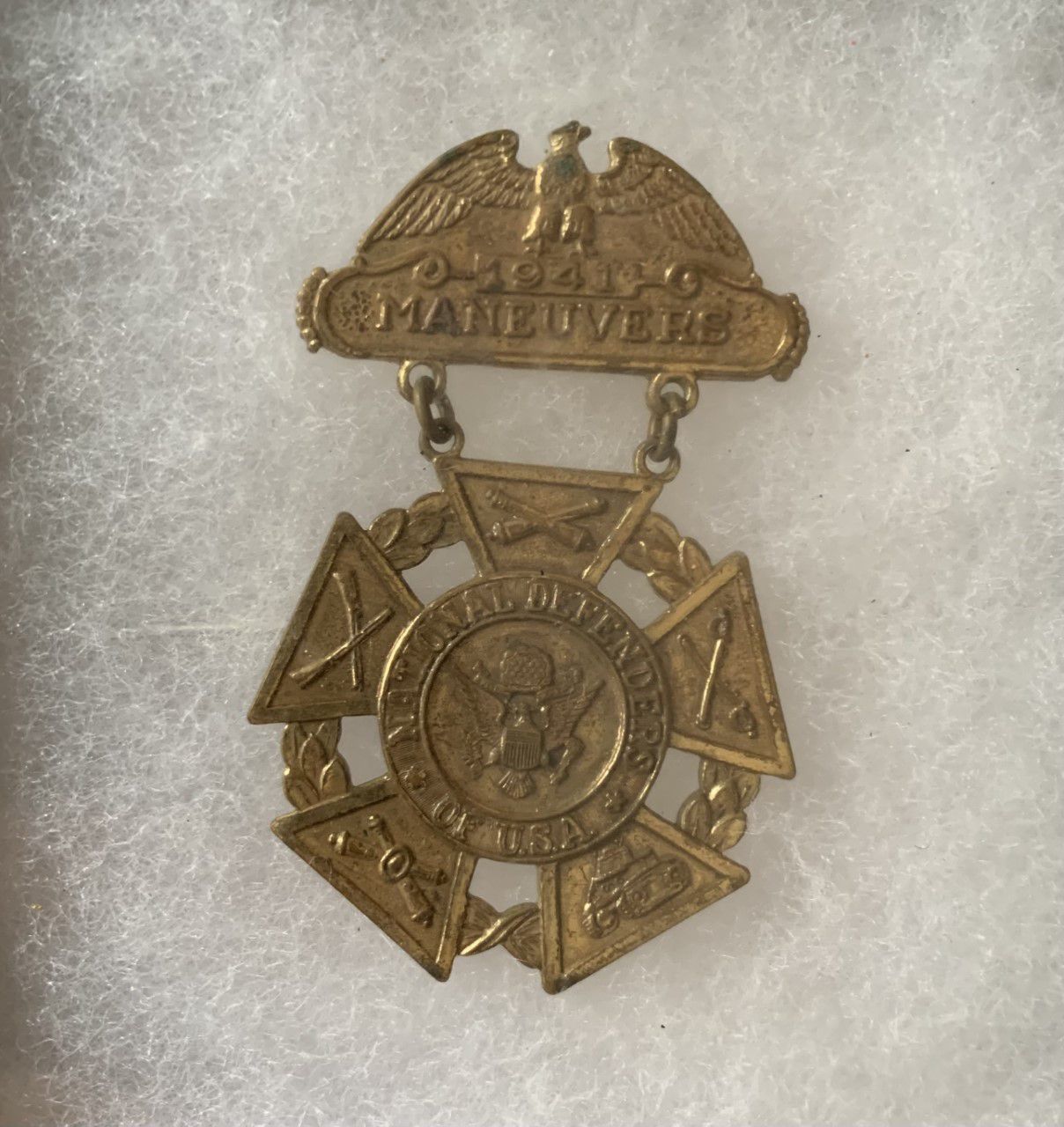 A maneuvers medal from 1941. The medal also depicts numerous war materials and says, " National Defenders of USA"Context