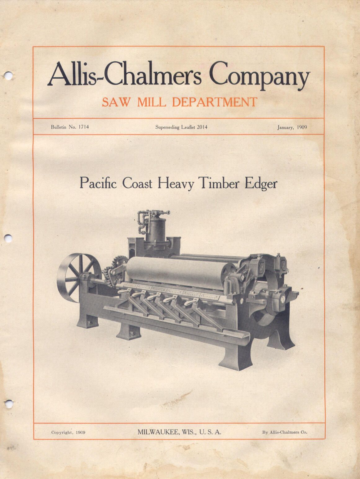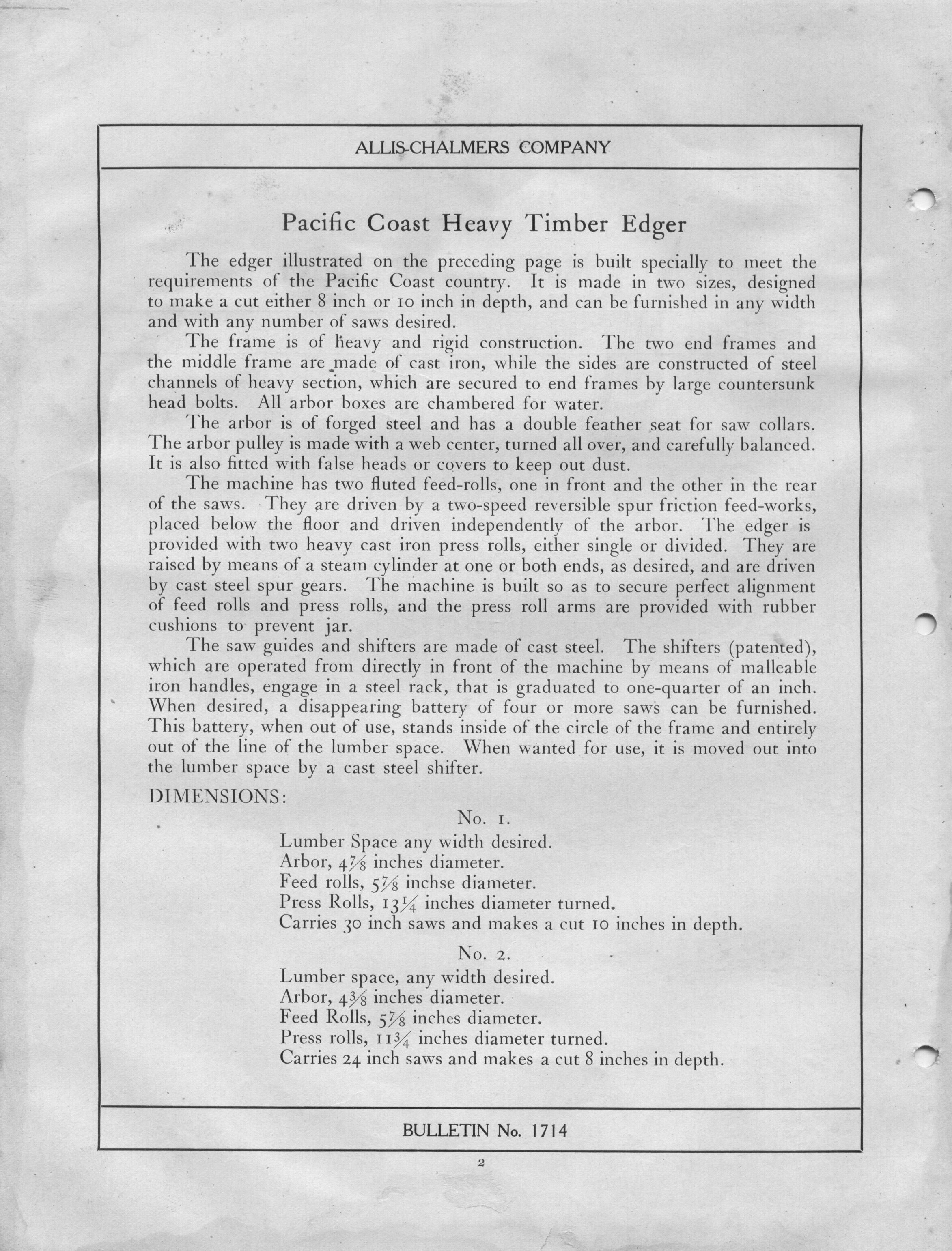 Out of New Orleans District company; features: Pacific coast heavy timber edger; made specially for the Pacific coast; comes in 2 sizes of 8 or 10 inch with any desired number of saws; description what its made out of